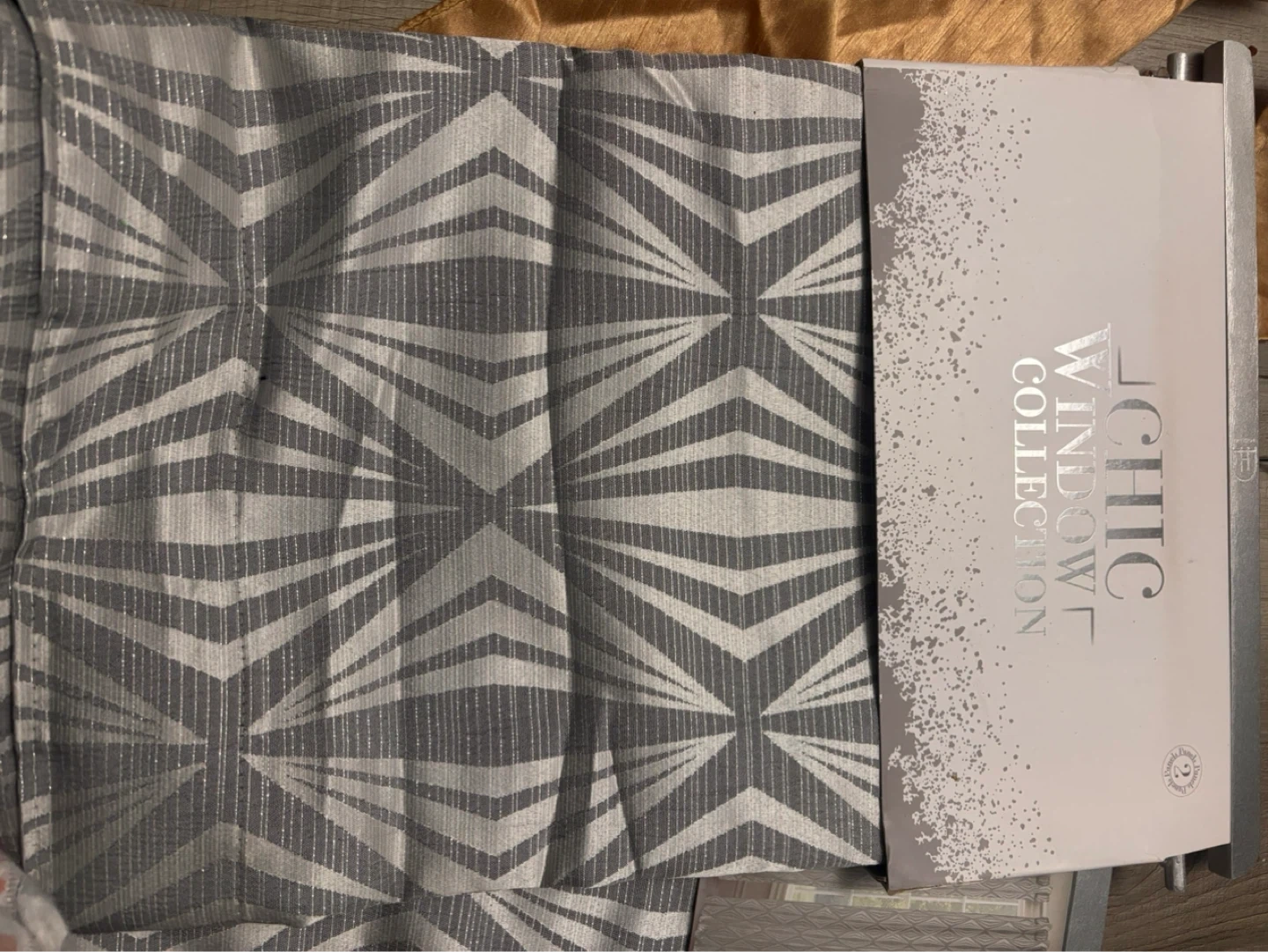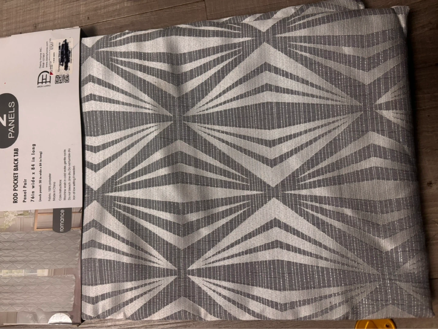 Rod pocket back tab curtain panels. Includes two 76in wide by 84in long panels. Fabric is 100% polyester. Machine wash cold, gentle cycle. Do not bleach or tumble dry.