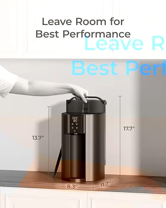 This electric water dispenser offers settings for hot, purity, and room temperature water. It has a digital display showing temperature and water level. The unit measures 17.7" tall, 8.3" wide, and 11.7" deep. It provides hot, pure, and room temperature water options.