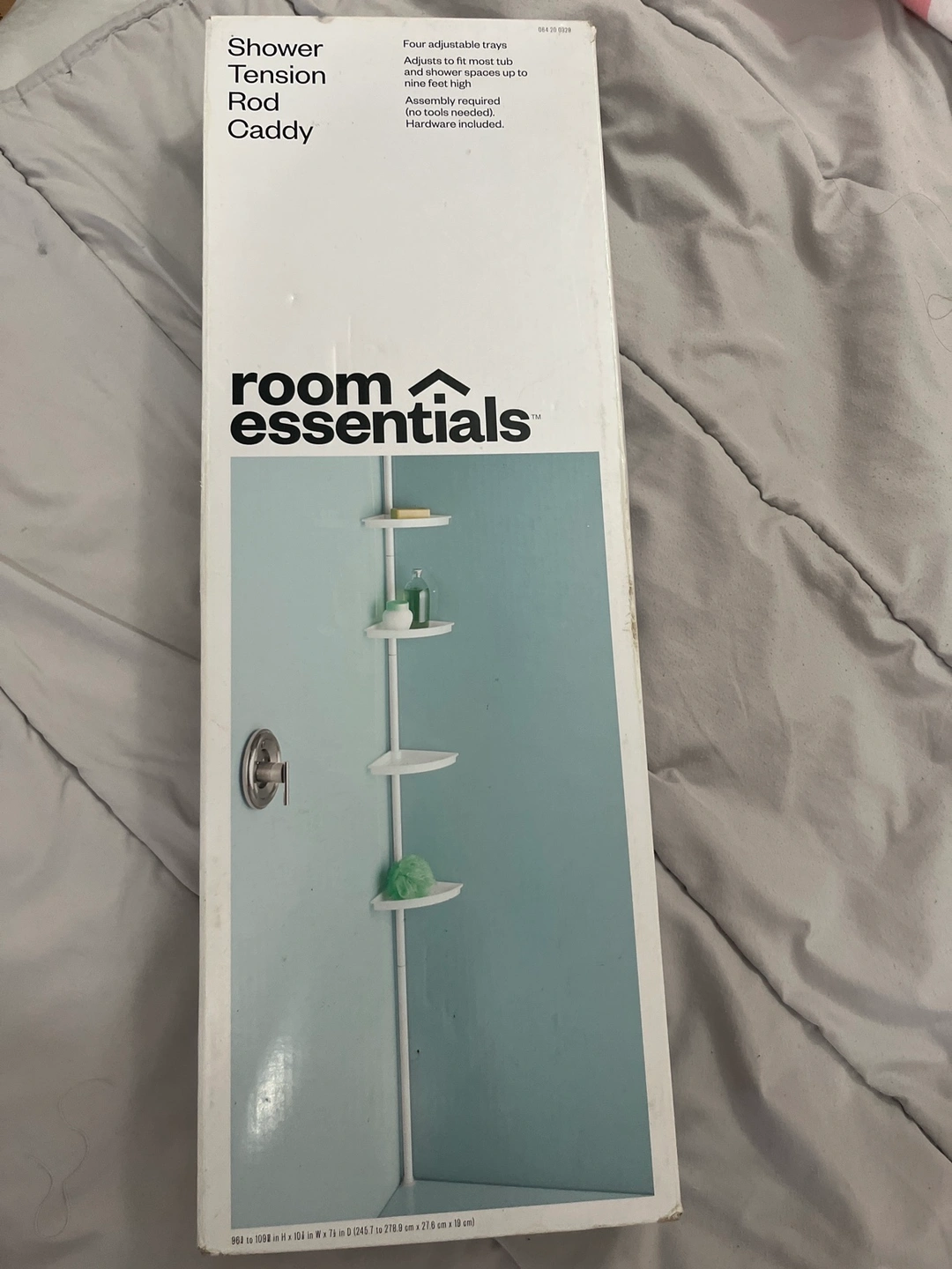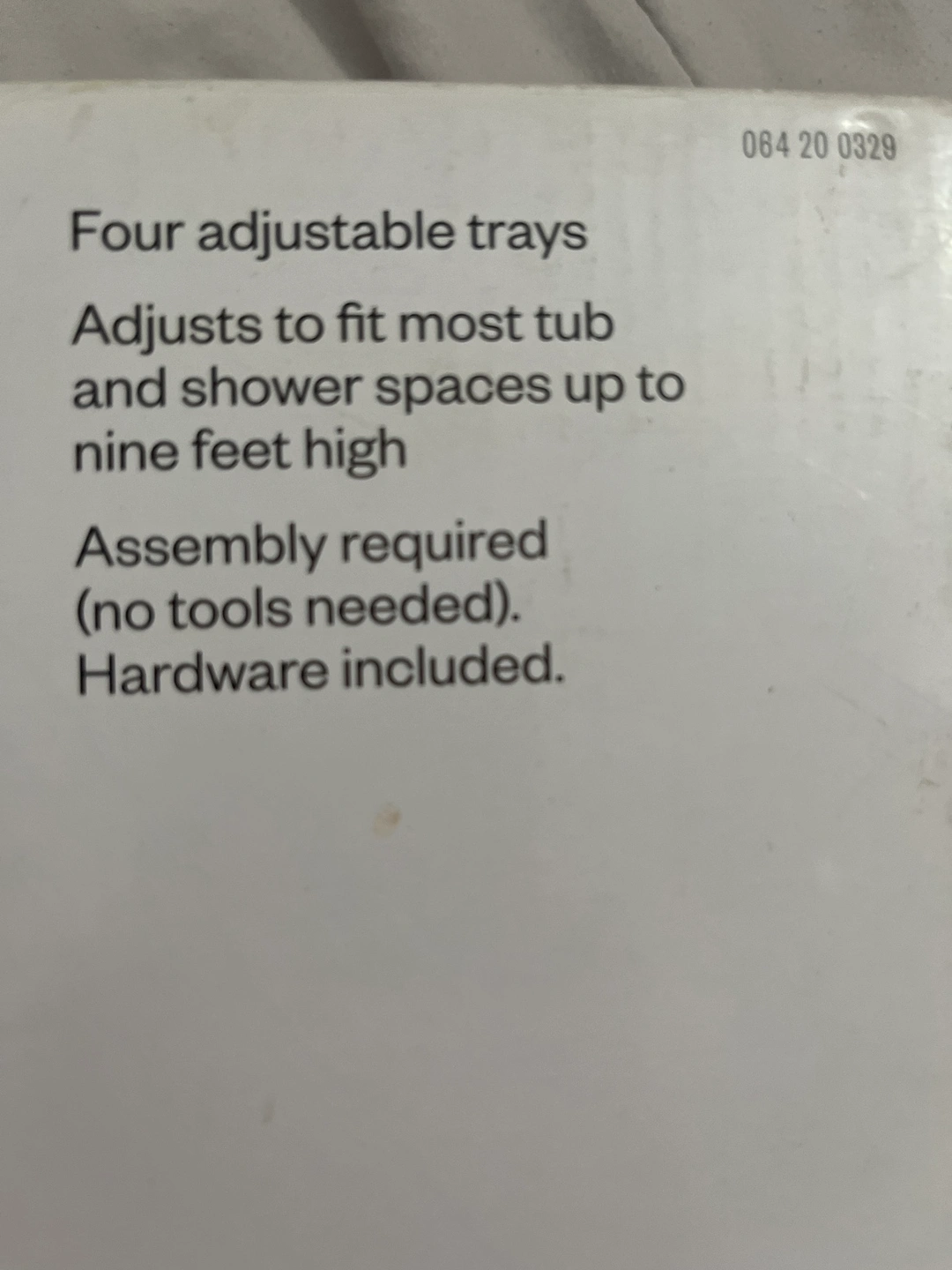 Four adjustable trays, adjusts to fit most tub and shower spaces up to nine feet high. Assembly required (no tools needed), hardware included.
