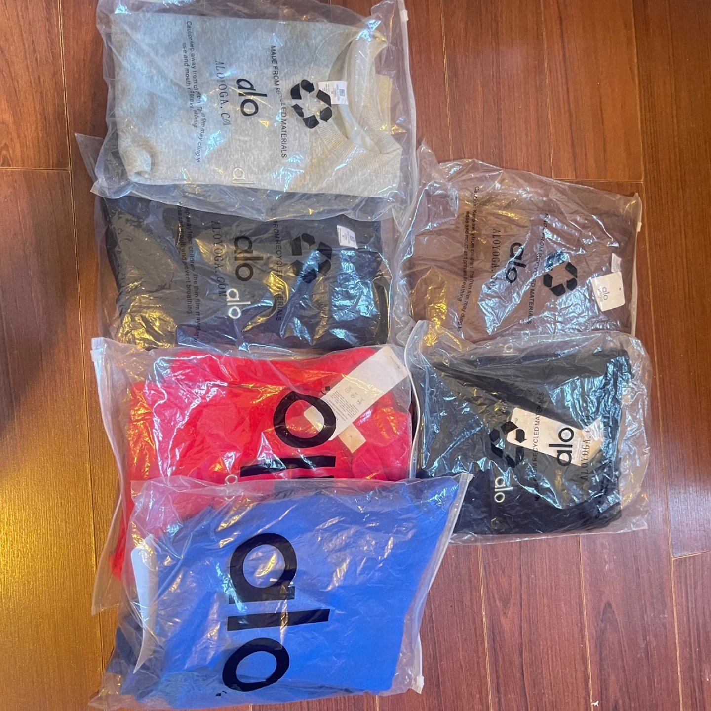 This is a bundle of Alo Yoga sweatshirts. They're made from recycled materials and come in various colors including grey, black, brown, red, and blue. Individual sizing is not specified.