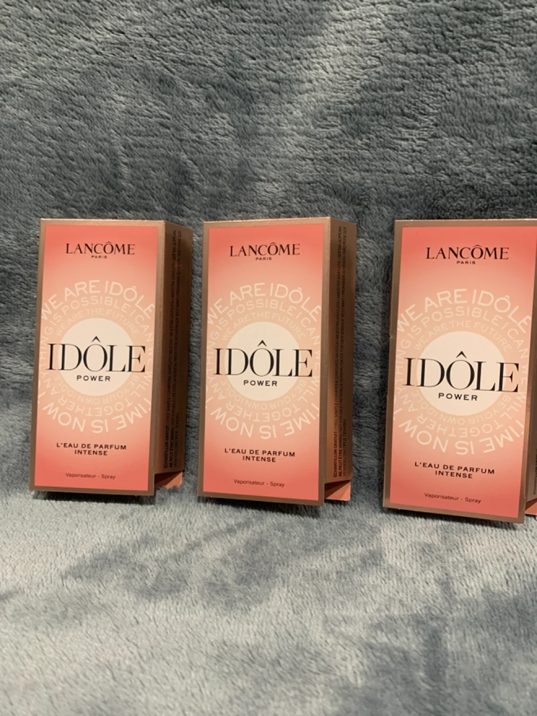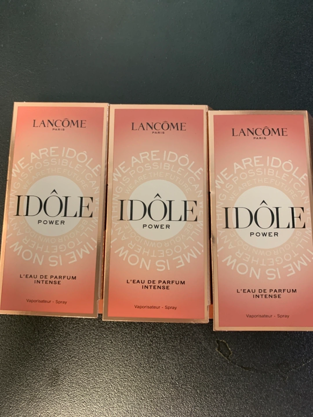 Three new Lancôme Idôle Power Eau de Parfum Intense spray bottles. Each bottle is 1.2ml. These are travel-sized perfumes.