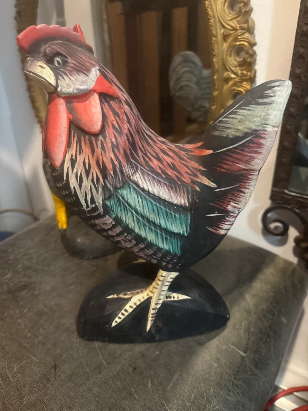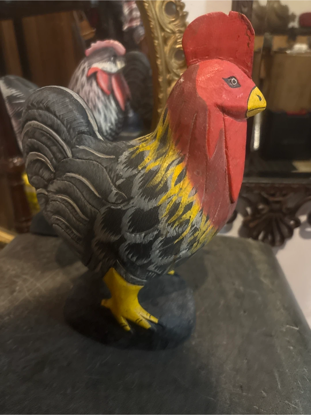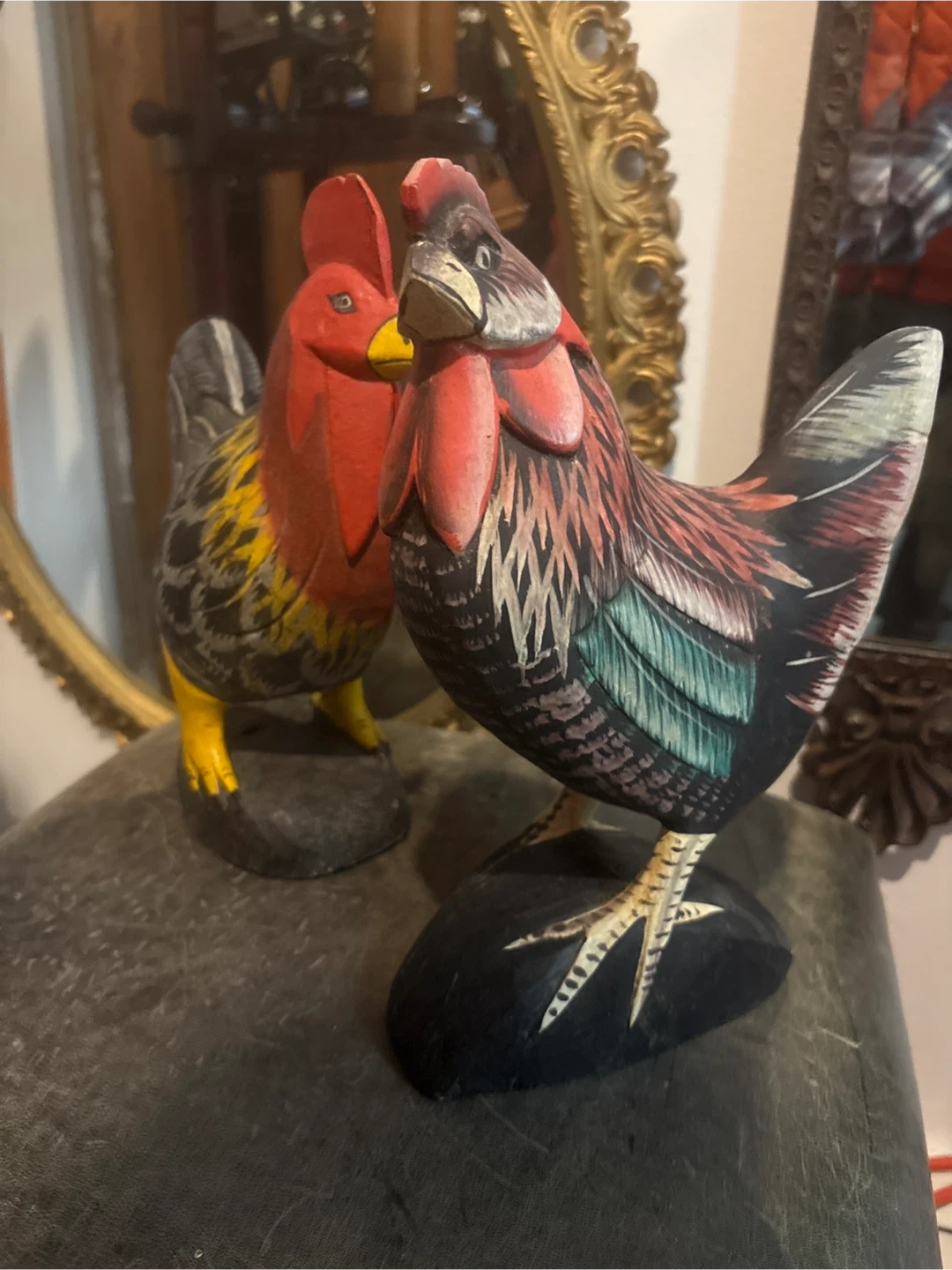 A charming hand-painted pair of playful woody painted cocks -wooden rooster figurines, showcasing vibrant colours and intricate details. These playful decorative pieces would add a rustic touch to any home decor.