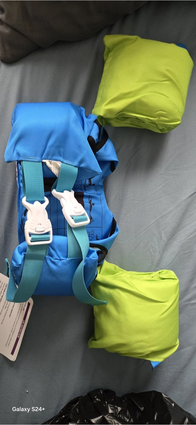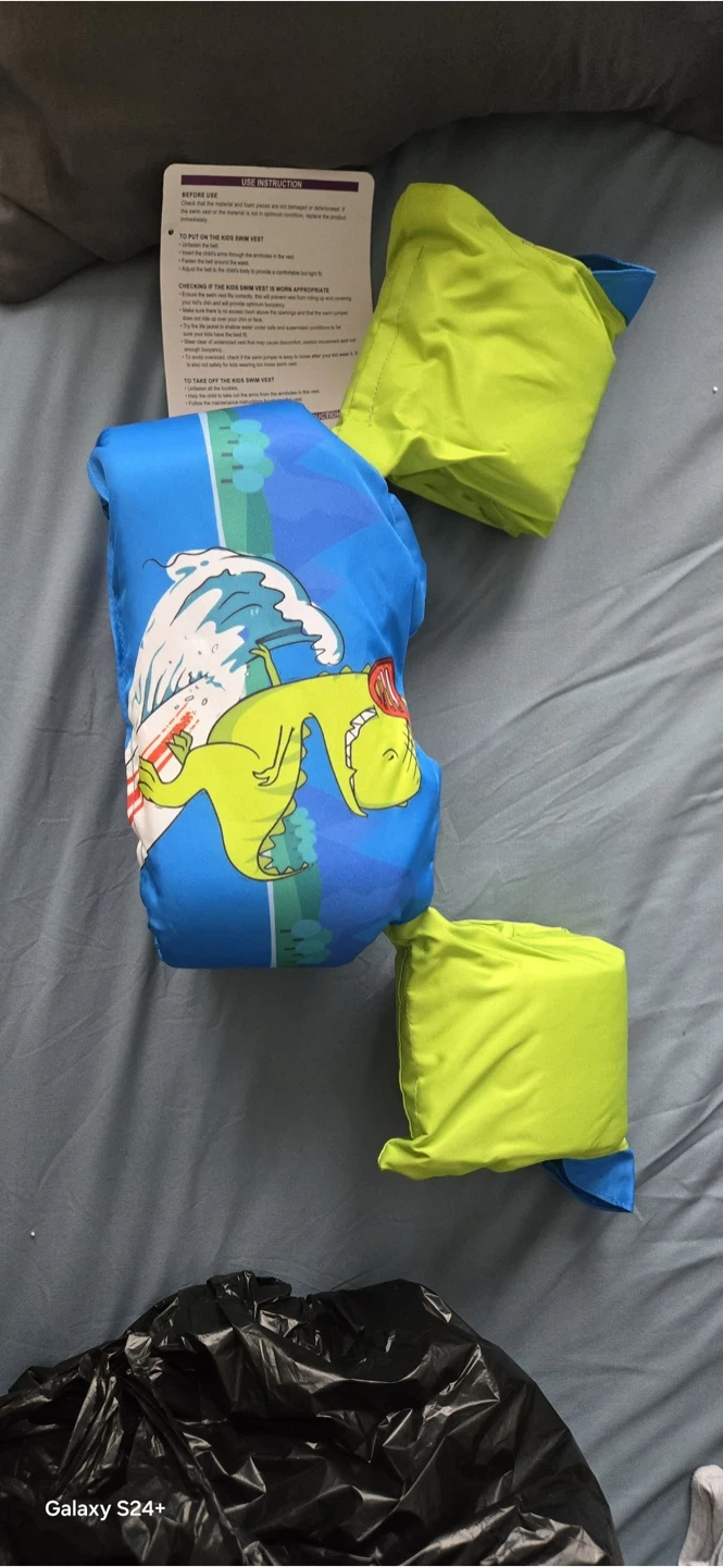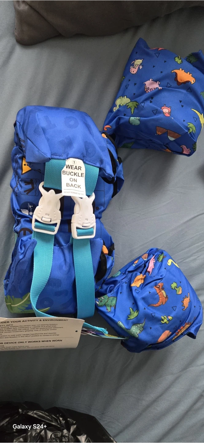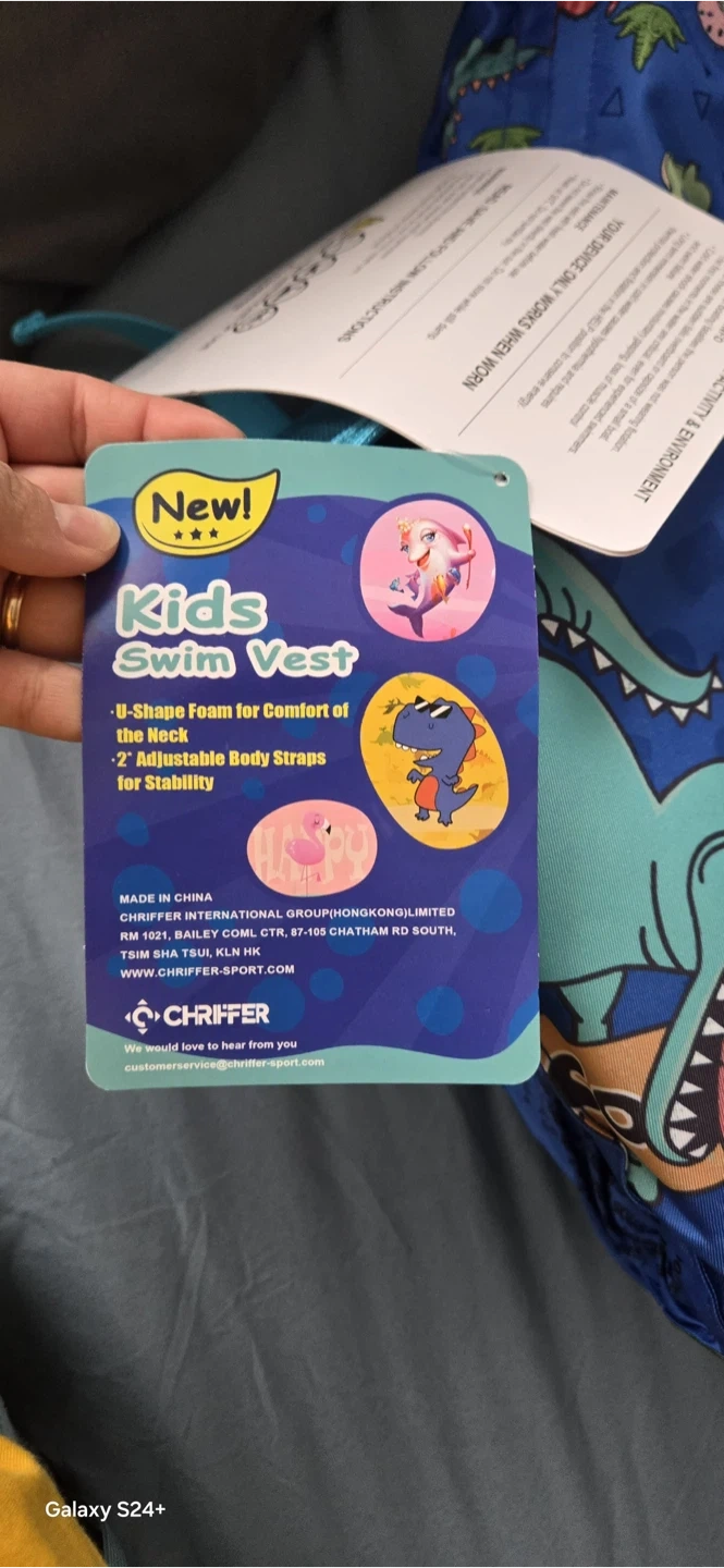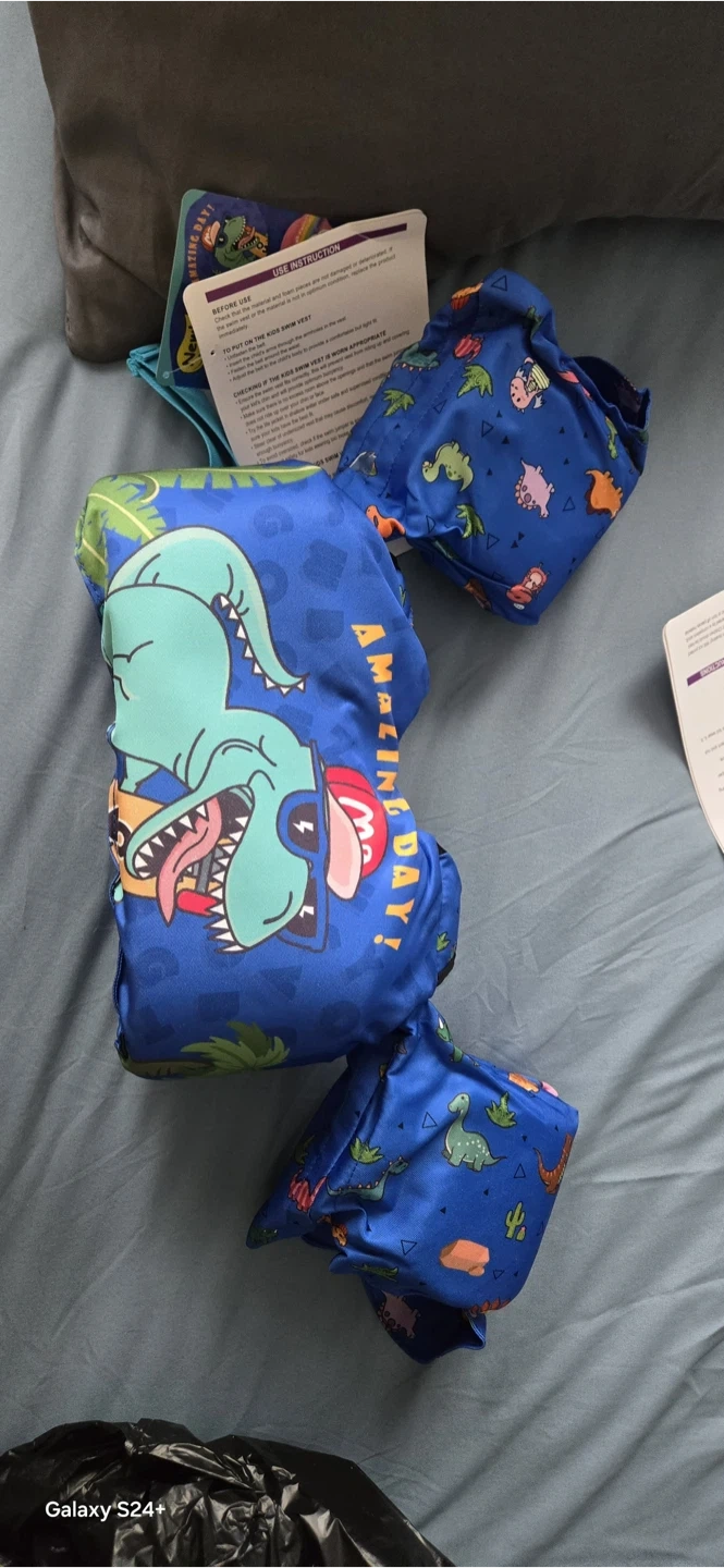 This kids swim vest features U-Shape foam for neck comfort and adjustable body straps for stability. It's designed with fun dinosaur prints. This vest is for children learning to swim.