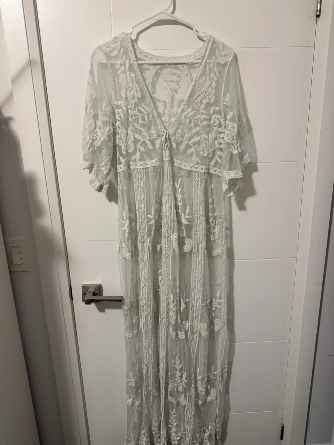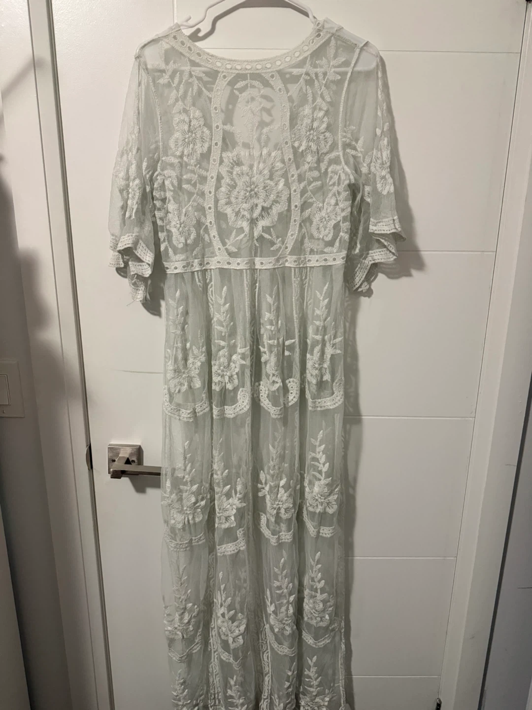 This beautiful sheer lace maxi dress features intricate floral embroidery throughout. It has a deep V-neckline and flutter sleeves. Perfect for layering over swimwear or as a stylish beach cover-up.