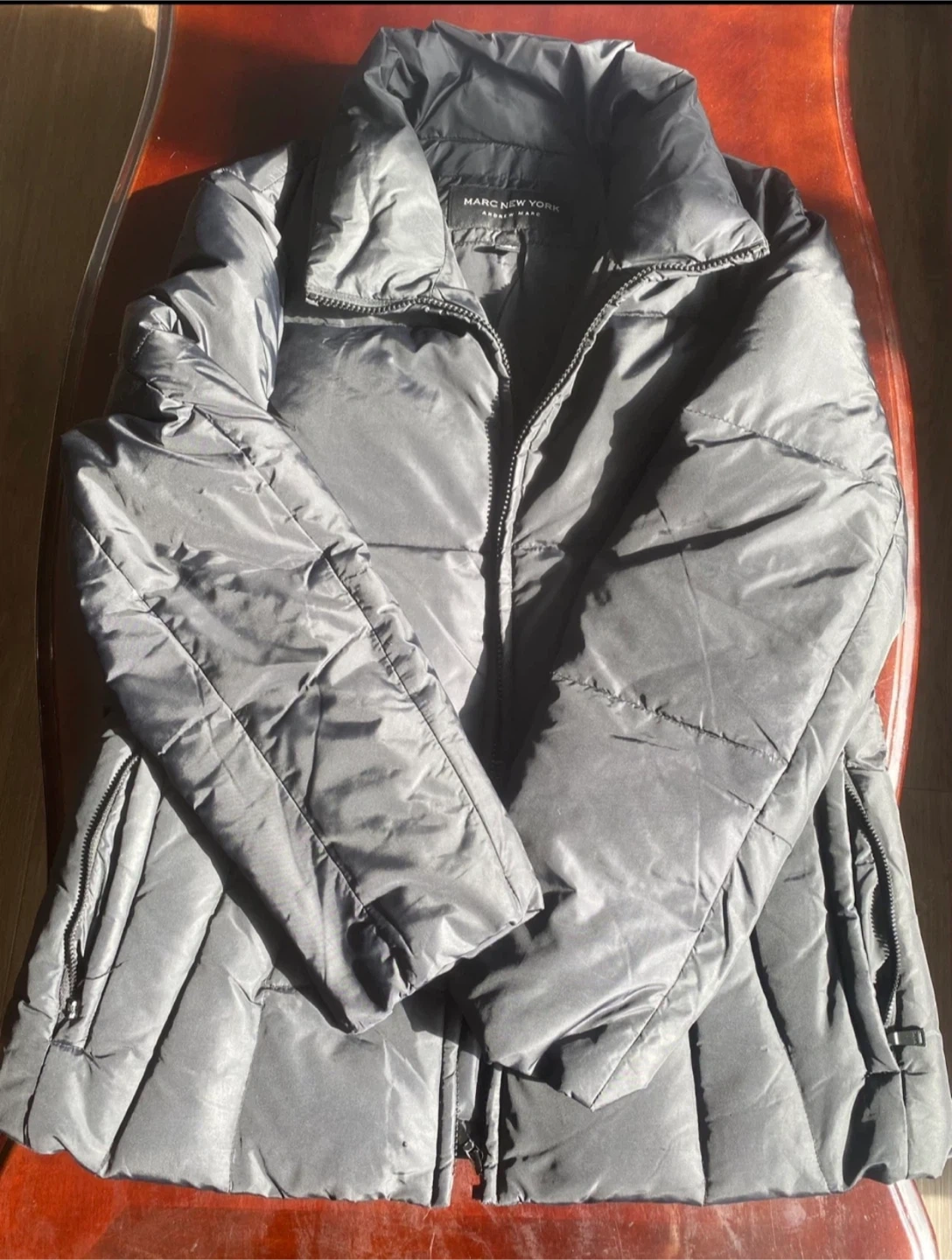 This Marc New York Andrew Marc puffer jacket is a size medium. It's a stylish and warm option for cooler weather. It features a full zip front and zippered pockets.