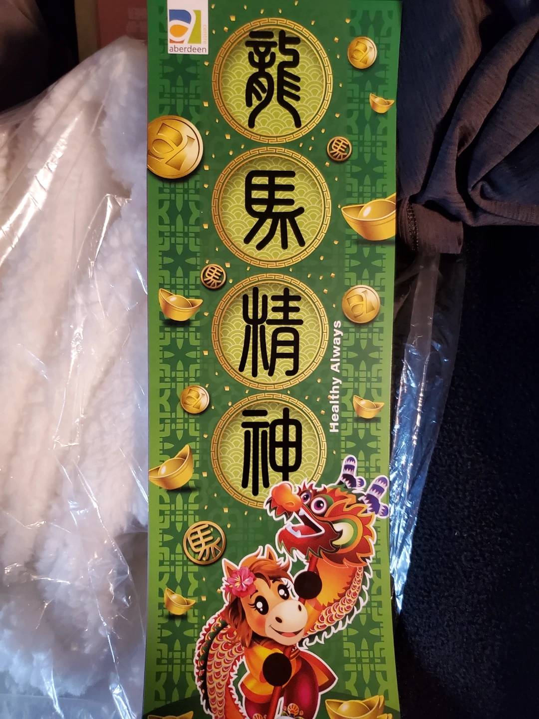 This is a festive decoration from Aberdeen Centre, featuring traditional Chinese characters and imagery like a dragon and horse. It's designed to celebrate the Chinese New Year. The decoration measures approximately 12 inches long.