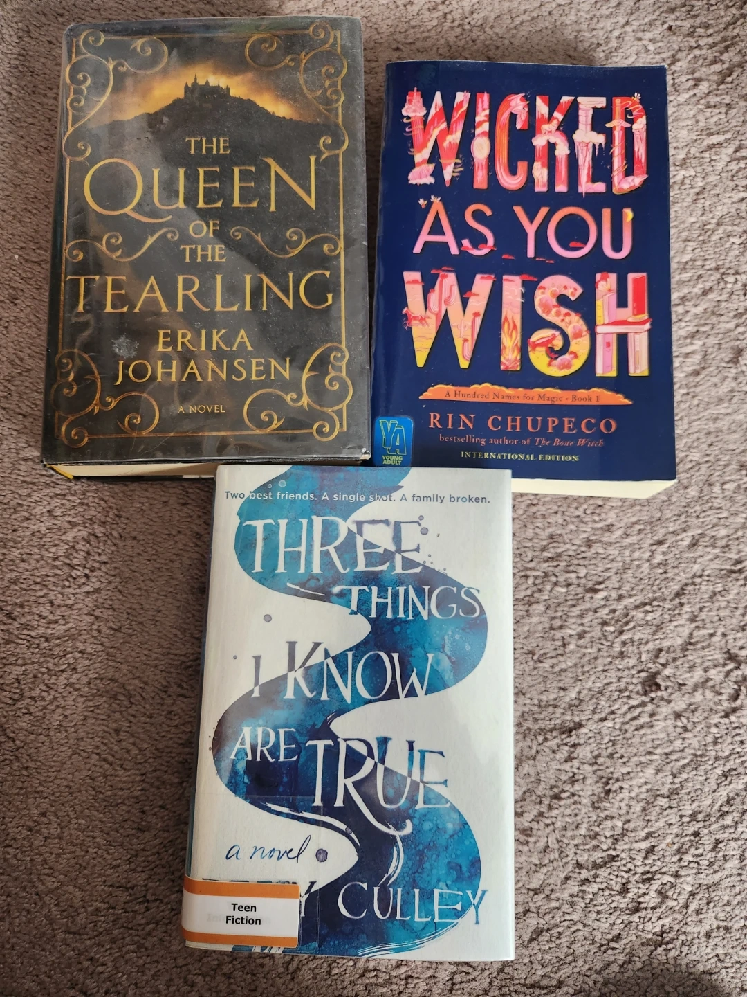 A bundle of three young adult fantasy novels. "The Queen of the Tearling" by Erika Johansen and "Wicked as You Wish" by Rin Chupeco. Also includes "Three Things I Know Are True" by Julie