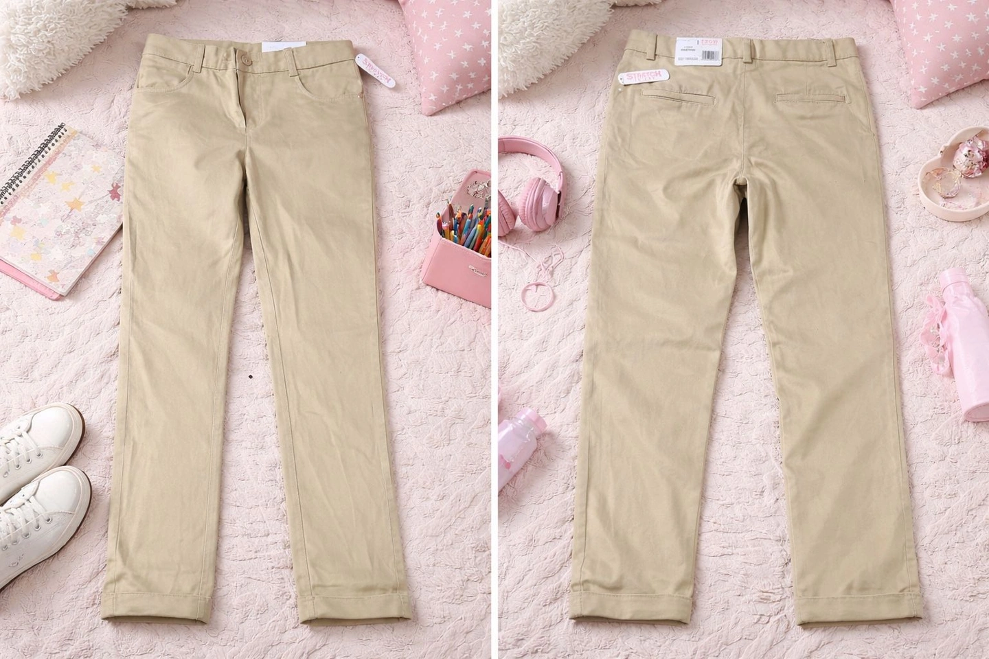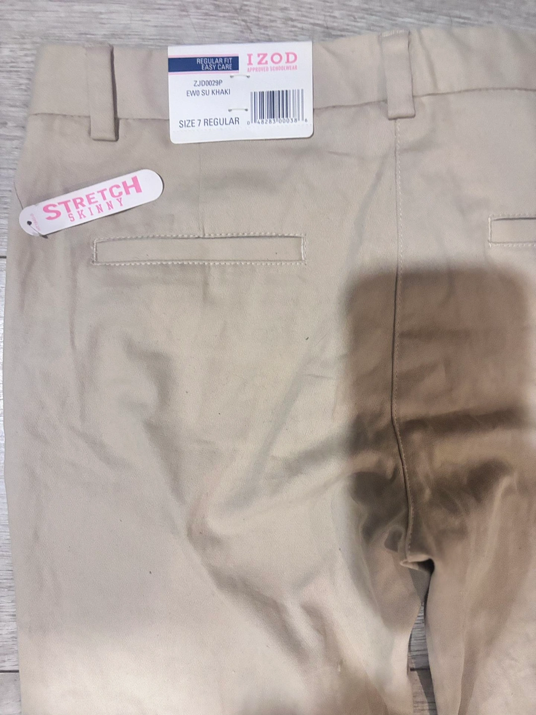 Brand new IZOD Approved Schoolwear khaki pants in Size 7 Regular. Features a stretch skinny fit that’s comfortable, flexible, and polished—perfect for school uniforms or everyday wear. Measures 14 1/2 waist and 39 inches in length. Made with easy-care fabric designed for durability and all-day comfort. Neutral khaki color pairs easily with uniform tops and shoes. Never worn, still has original tags attached. Brand: IZOD, Size: 7 Regular, Color: Khaki, Fit: Stretch Skinny, Condition: New with tags, School uniform approved, Easy care / wrinkle-resistant.