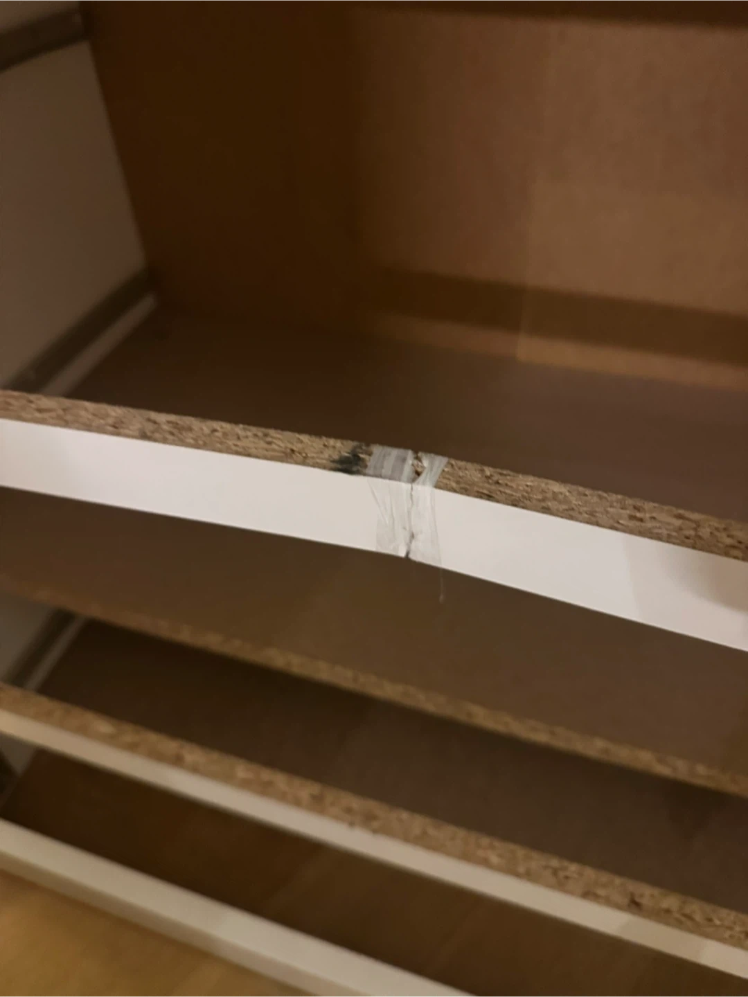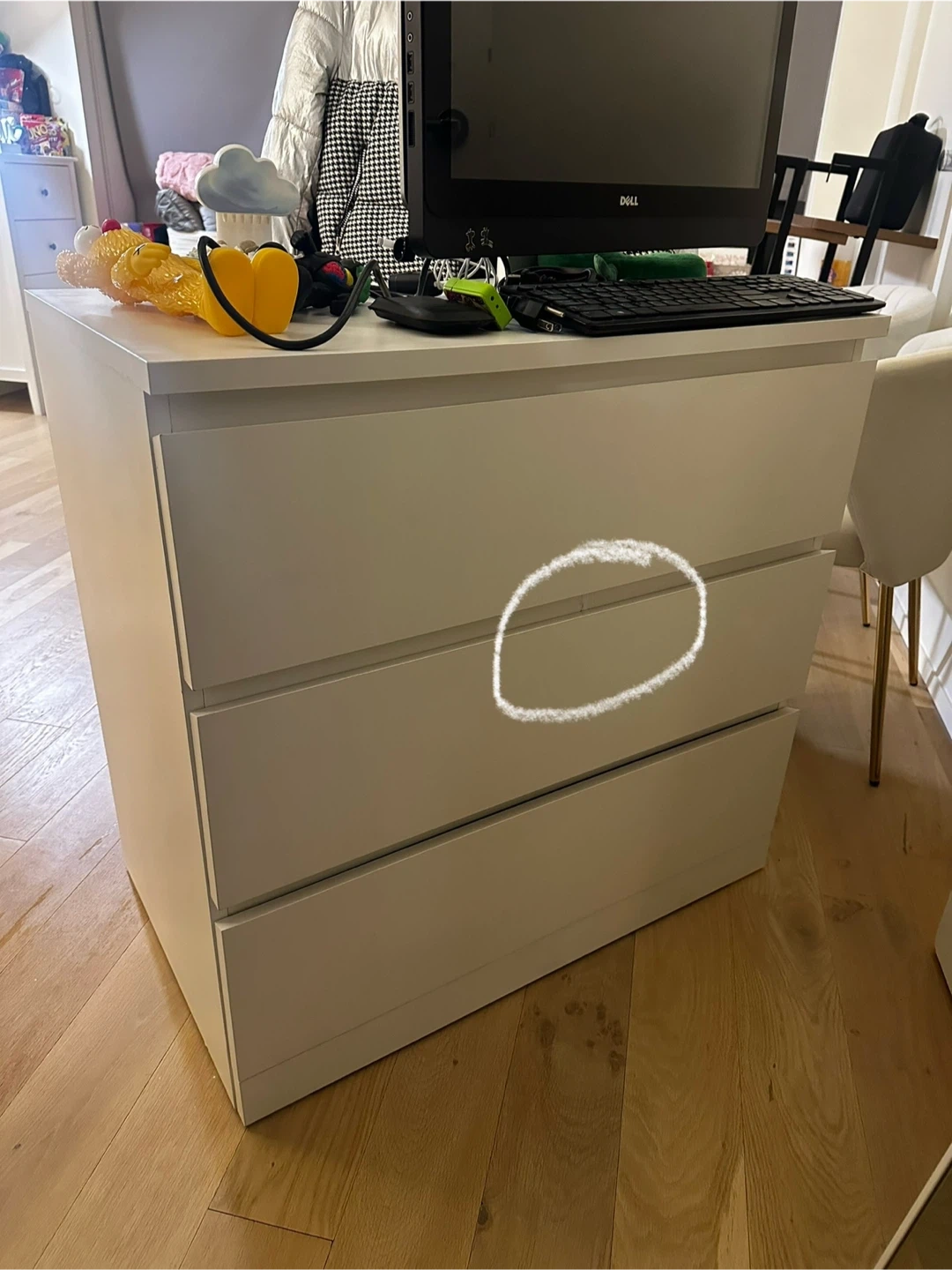 IKEA White three-drawer dresser. Some wear visible on the middle drawer divider as shown, I put up a piece of elastic to hold it together, if you’re handy and can get it back together is a great piece and the drawers have ton of space