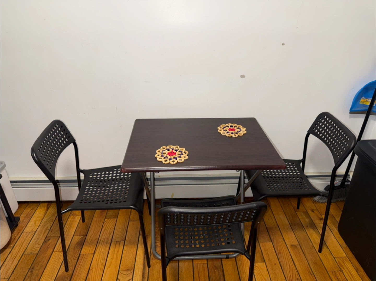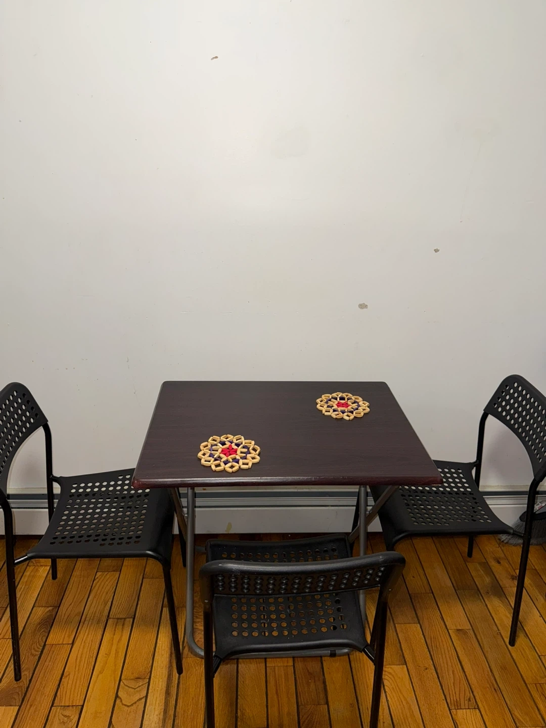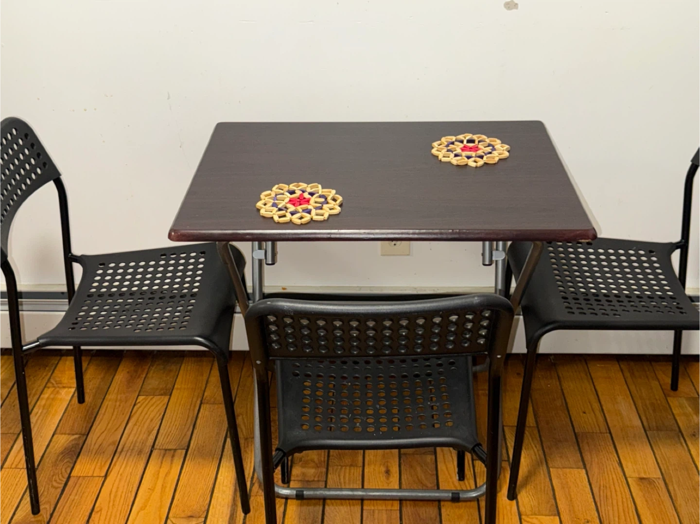 Este conjunto incluye una mesa plegable de color marrón oscuro y tres sillas de plástico negro. Las sillas presentan un diseño moderno y perforado. Sobre la mesa hay dos posavasos decorativos. ¡Es ideal para espacios pequeños!
