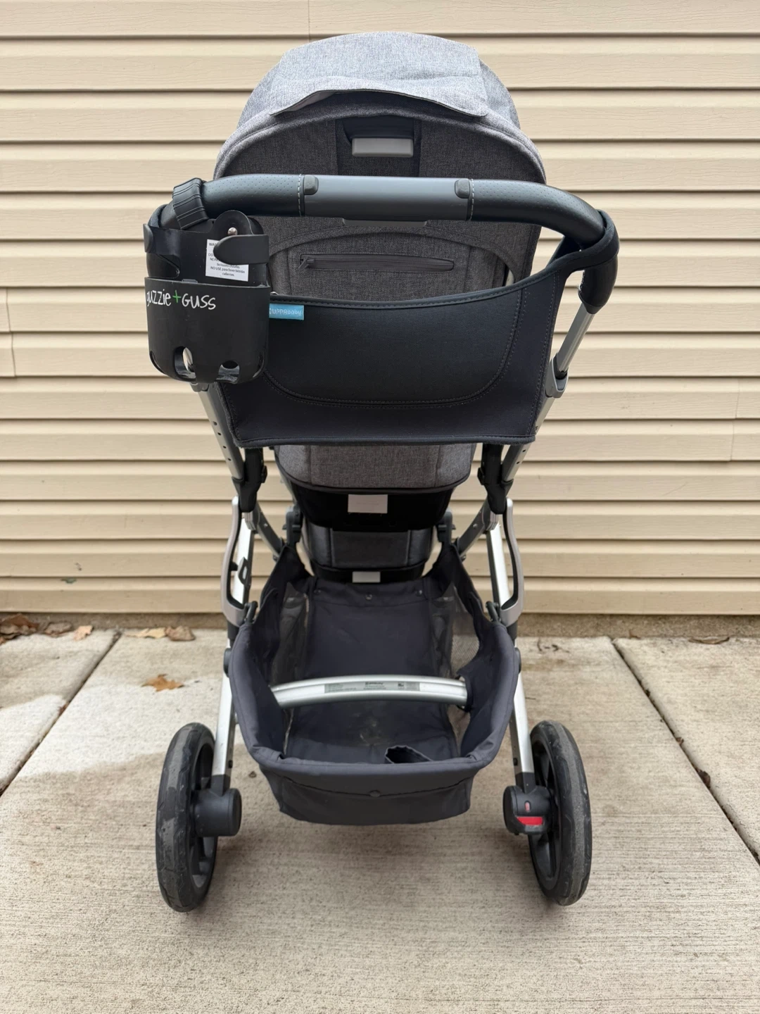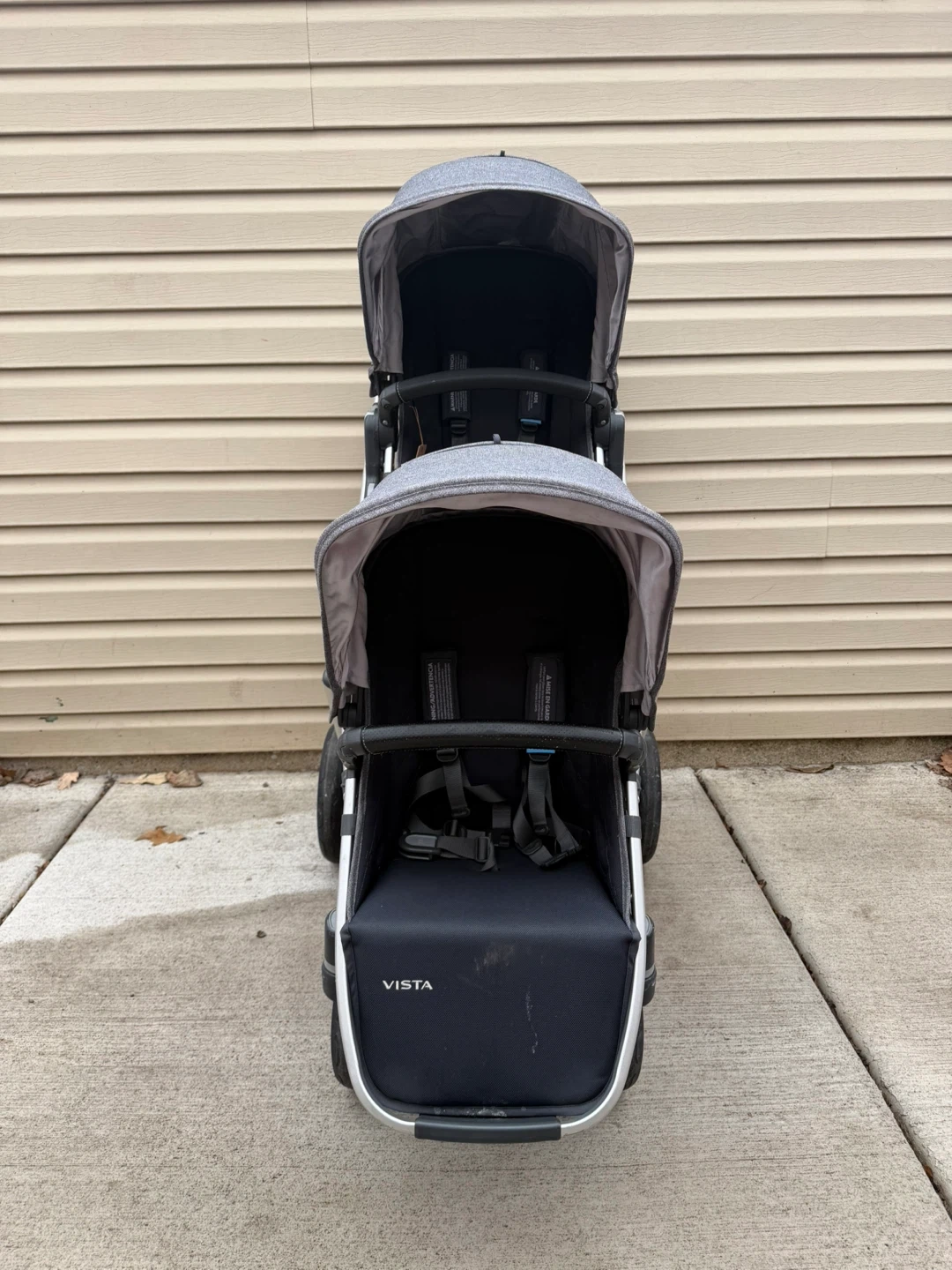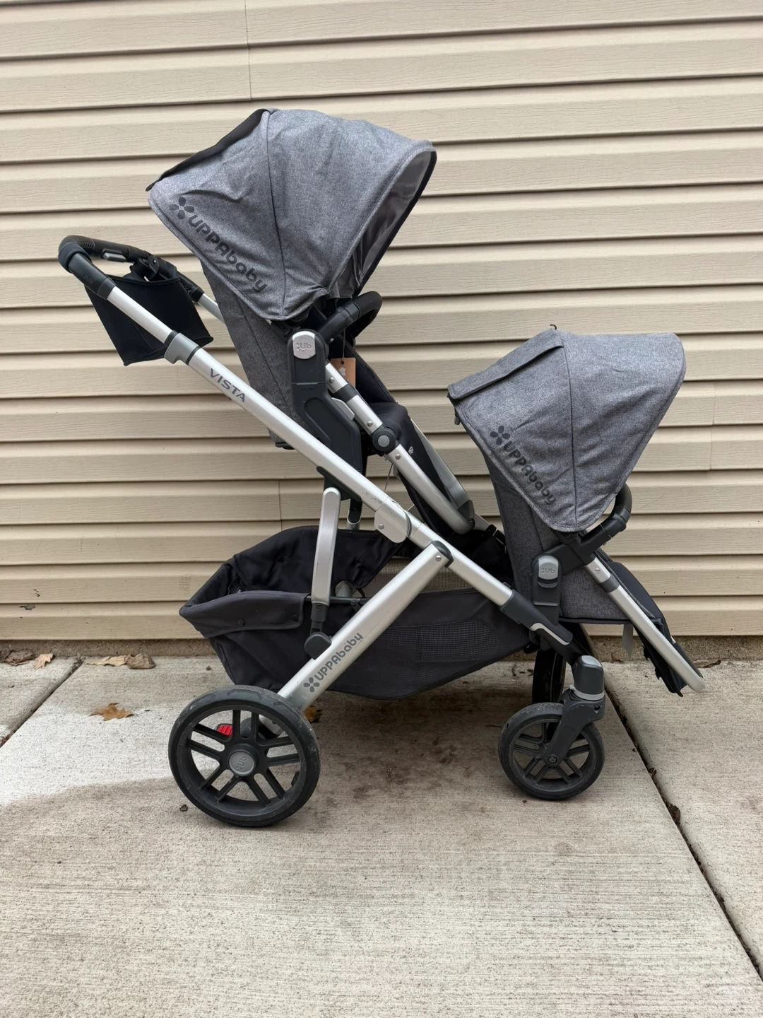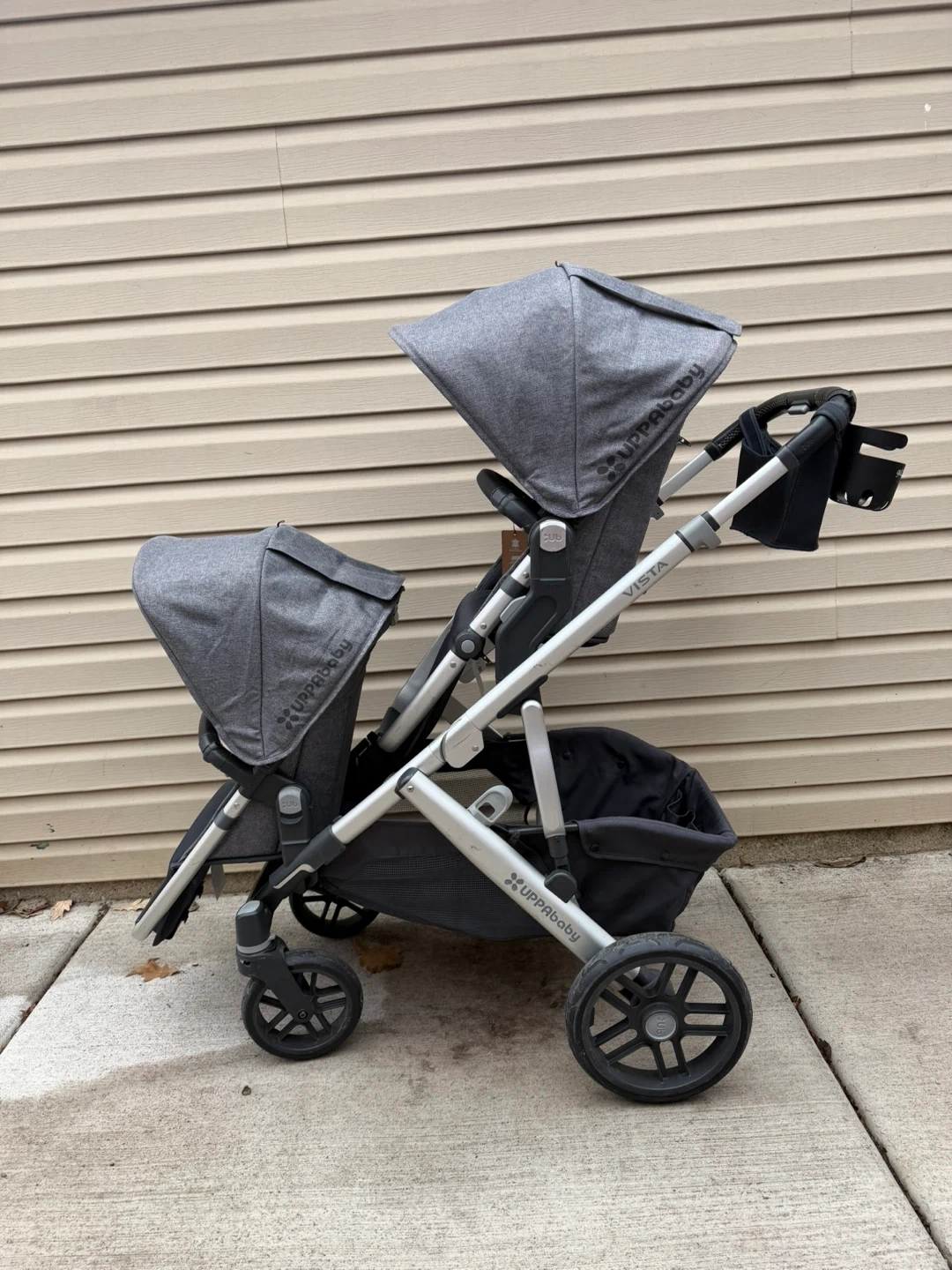 This is a gray UPPAbaby Vista double stroller. It has two seats and a large storage basket. The stroller includes a parent console and cup holder.