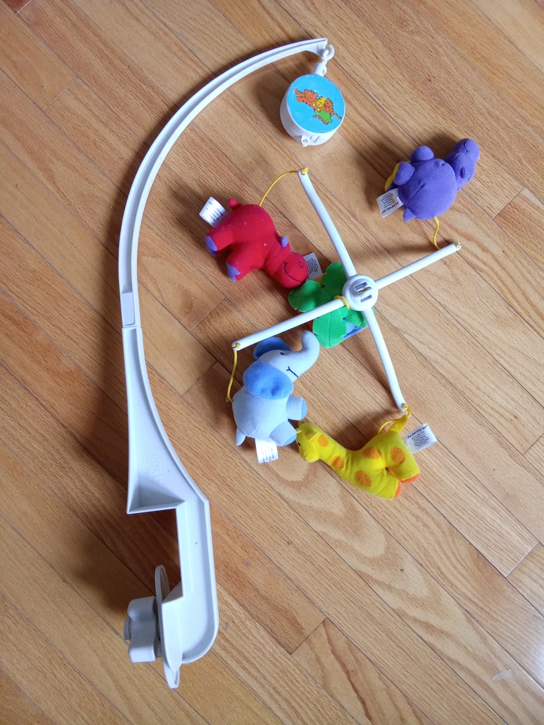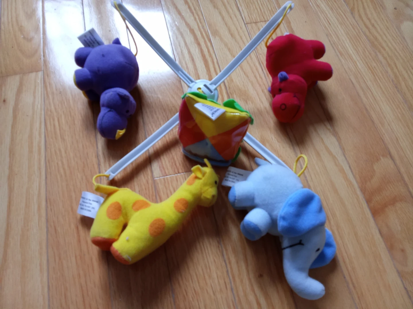This baby crib mobile features four plush hanging animals: a red hippo, a purple bear, a blue elephant, and a yellow giraffe. It includes a white mobile arm that attaches to the crib. Great for soothing babies to sleep!