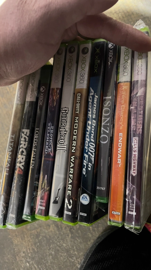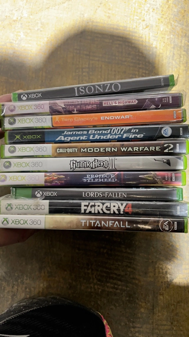 Selling a collection of used Xbox 360 games including Isonzo, Hells Highway, Tom Clancy's Endwar, James Bond 007 in Agent Under Fire, Call of Duty Modern Warfare 2, Guitar Hero II, Protect Sylpheed, Lords of Fallen, FarCry 4, and Titanfall. All games are in acceptable condition and function perfectly. If you see this ad, the games are available. $20 each, some are sealed brand-new.