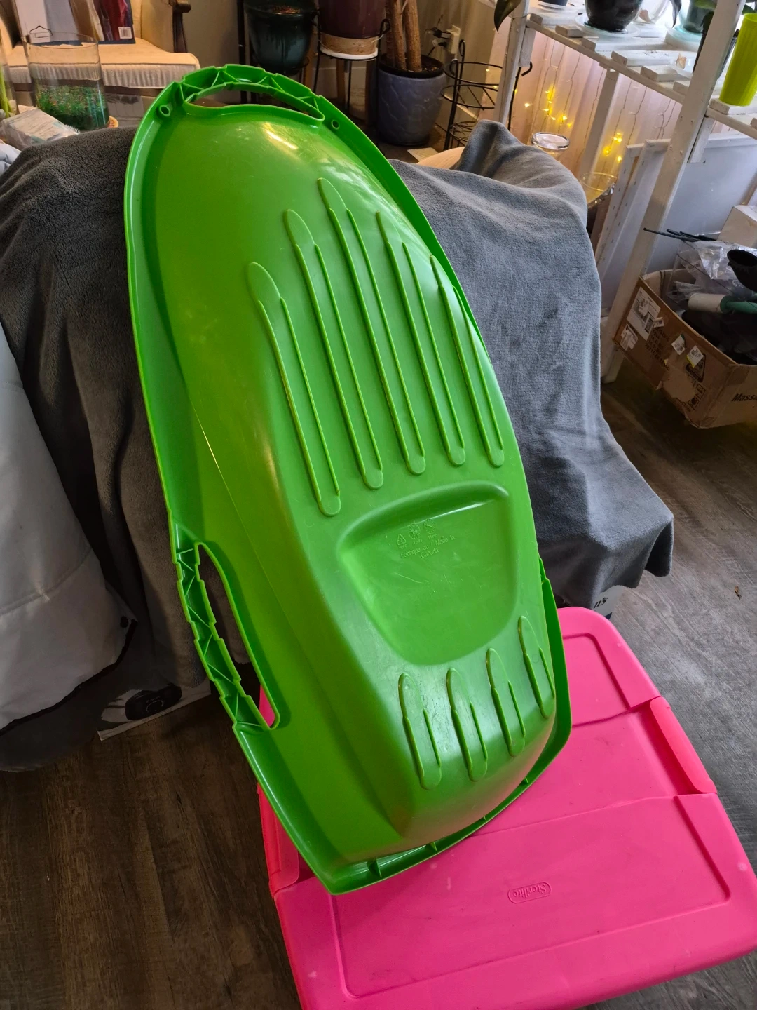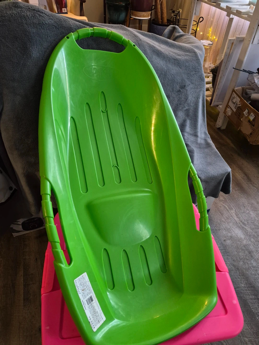 A bright green plastic toboggan sled for winter fun. It's lightweight and durable for sliding down snowy hills. Handles make it easy to carry. Ready for some snowy adventures!