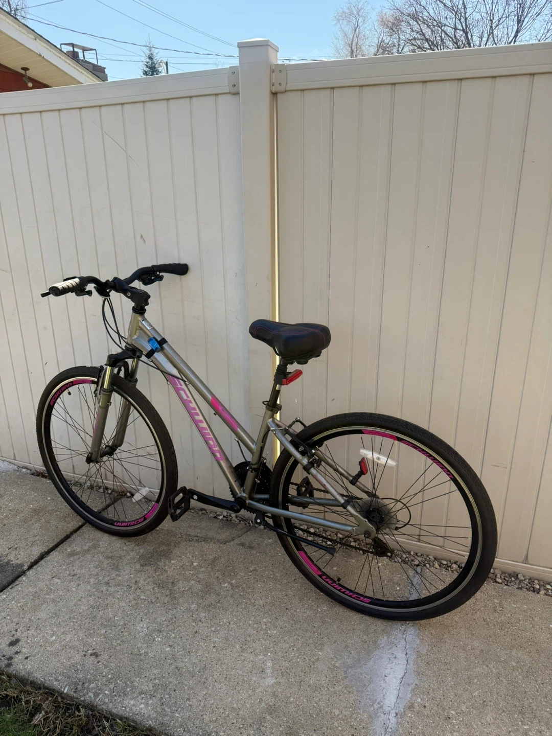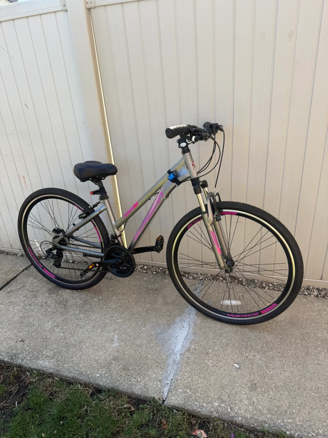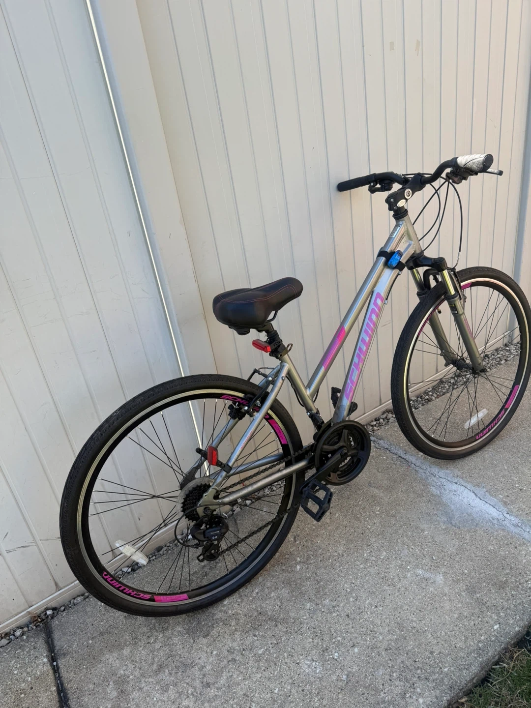 Like new garage kept Silver Schwinn hybrid bike with pink accents. Features a medium frame and comfortable seat. It's ready for your next ride! It comes with flashing lights worth $50