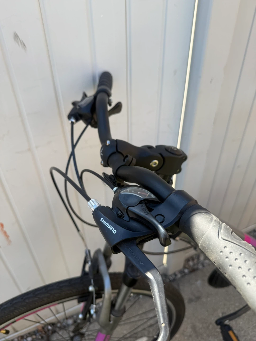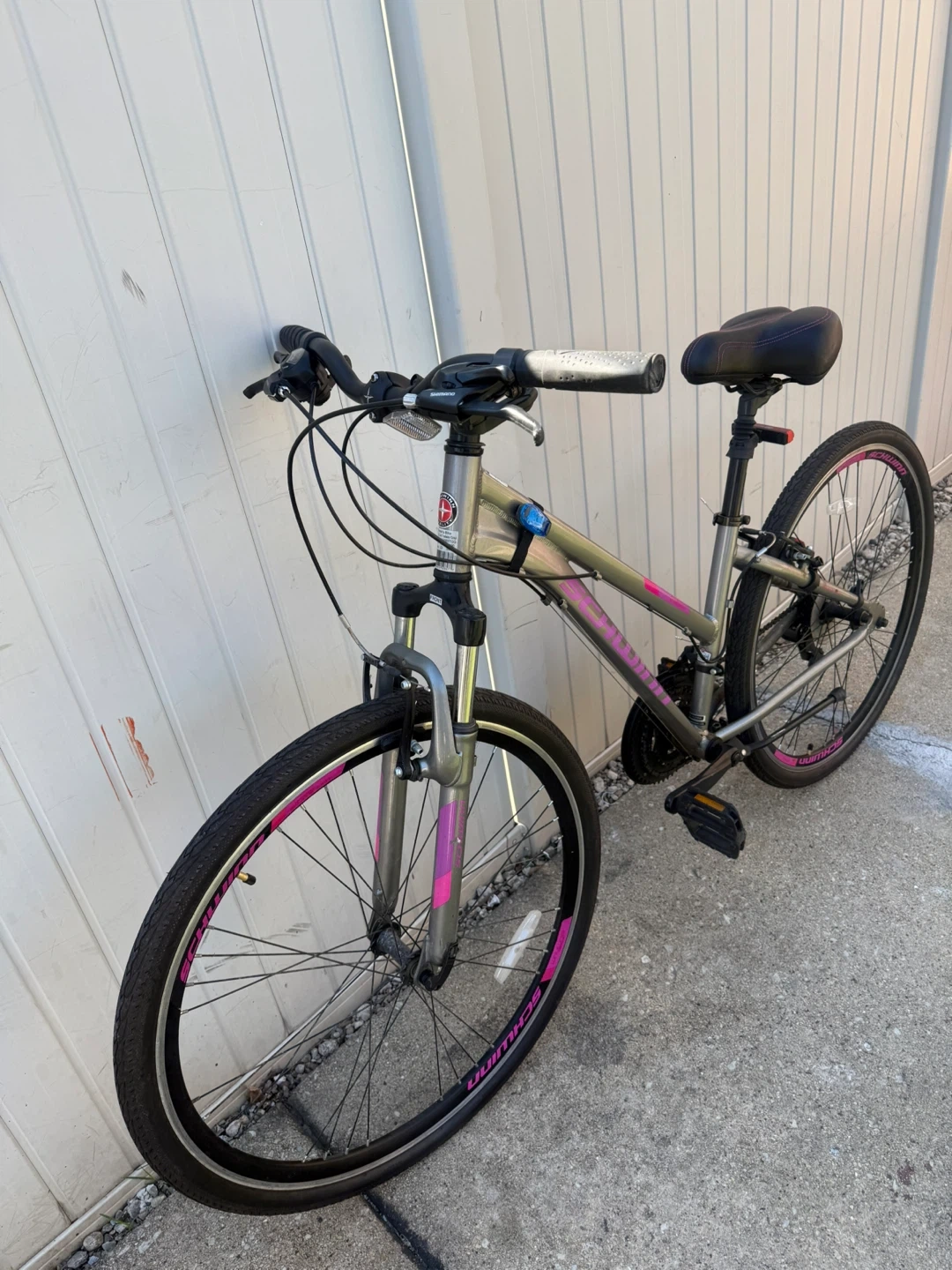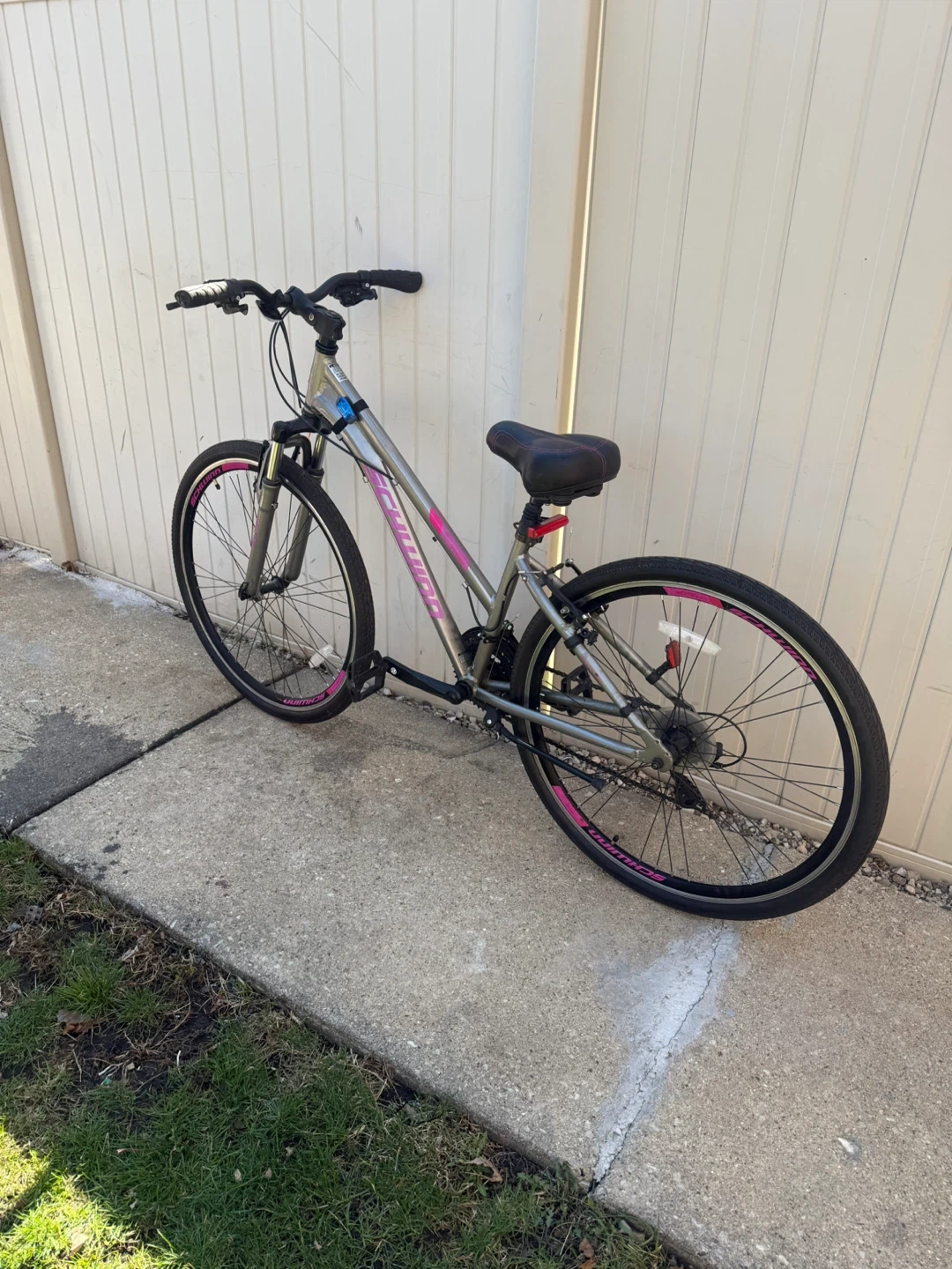 Like new garage kept Silver Schwinn hybrid bike with pink accents. Features a medium frame and comfortable seat. It's ready for your next ride! It comes with flashing lights worth $50