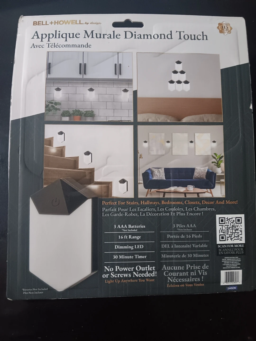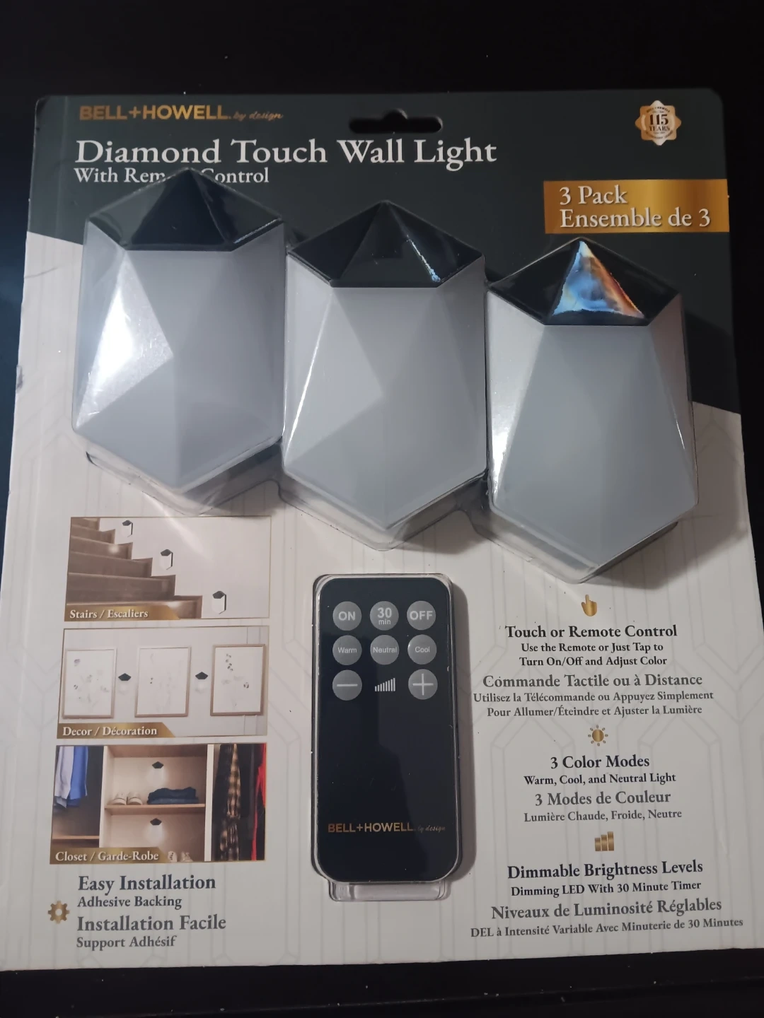 This is a 3-pack of Bell + Howell Diamond Touch Wall Lights with a remote control. They offer 3 color modes and dimming brightness levels with a 30-minute timer. Installation is easy with adhesive backing, and no power outlet or screws are needed.