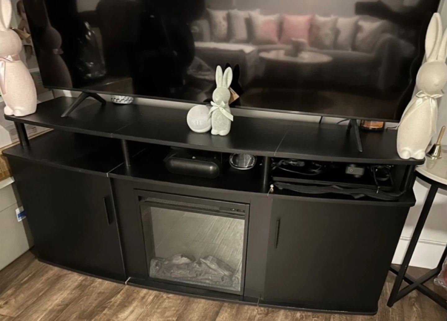 This black TV stand features an electric fireplace heater for a cozy ambiance. It offers ample storage space with cabinets and shelves.