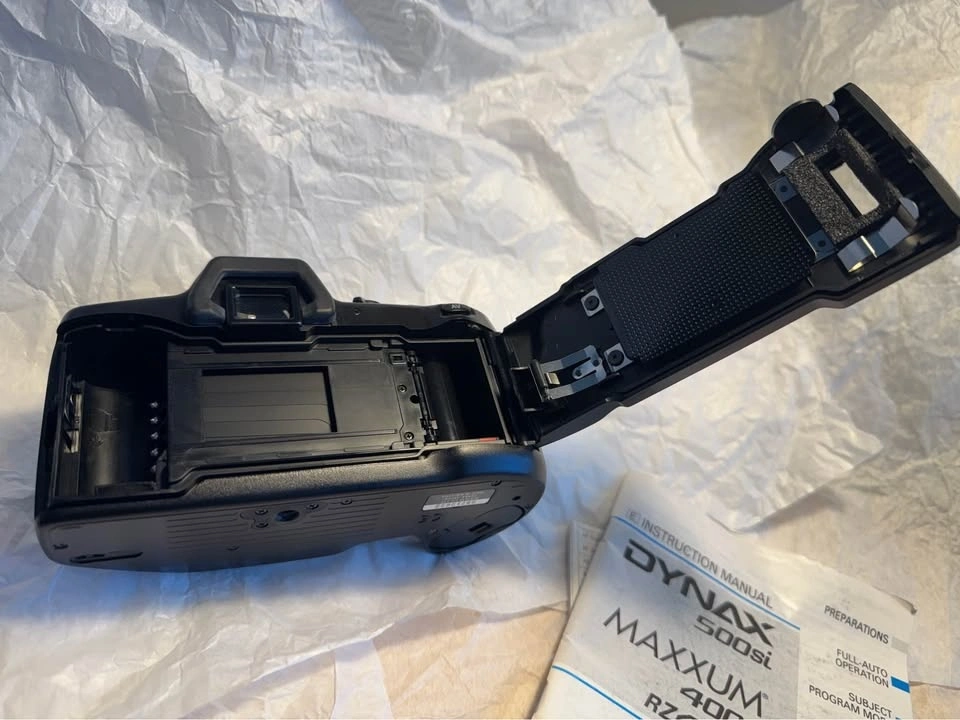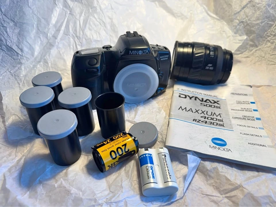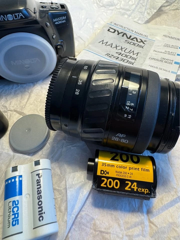 Bundle includes a lightly used, well-cared-for Minolta film camera (Maxxum 400si) with a 28-80mm AF kit lens (macro, f/4-5.6, clean, no haze, no fungus). Also includes 5 rolls of expired Kodak 35 film (ISO 200, 24 exposure) and one new Panasonic 2CR5 lithium battery. As a photography enthusiast, the camera has been cared for in detail and stored in a cool, dry place. The new battery was inserted recently to ensure it still works. The lens was recently used on another digital camera and works fine. More Kodak 35 film is available separately.