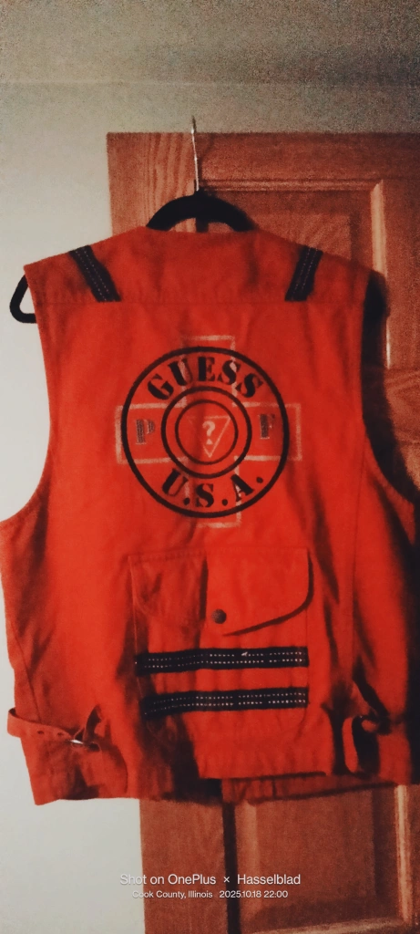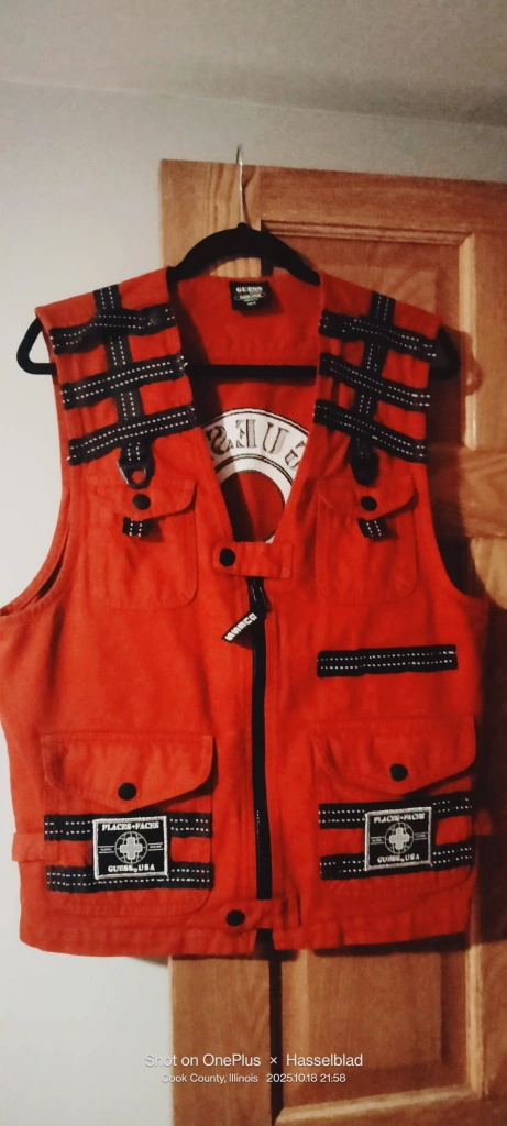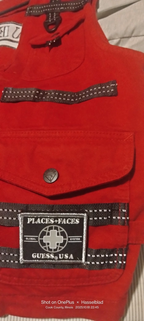 Selling a Guess Places+Faces vest in size medium. It's a vibrant red color and made of 100% cotton. The vest features 4 front pockets and 1 big back pocket and unique detailing. Perfect for bikers or adding a stylish touch to your outfit.I'ts new without tag.