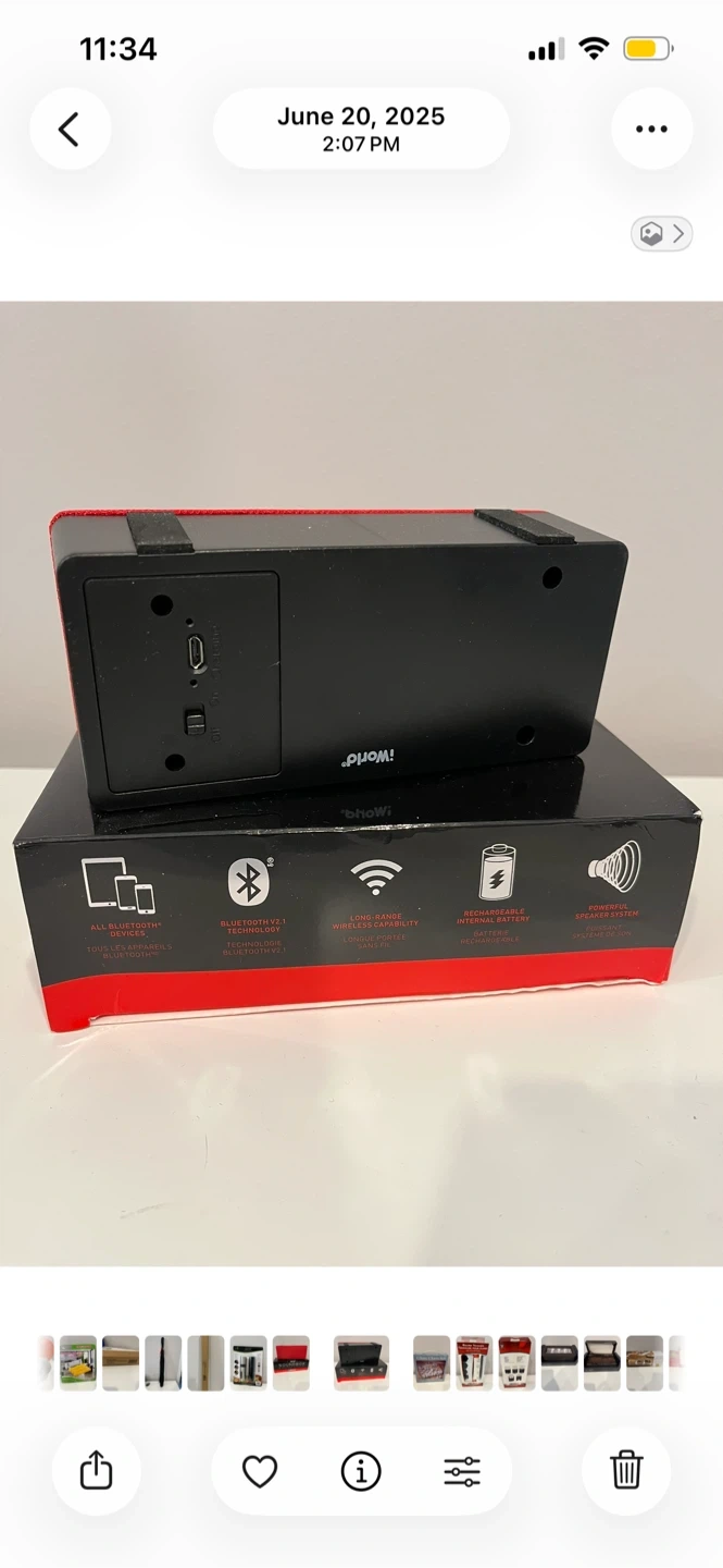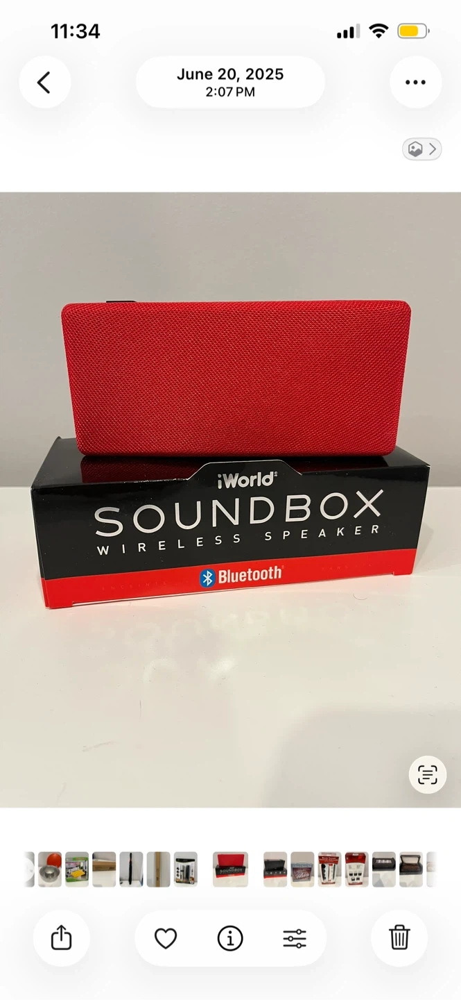 This is a red iWorld Soundbox wireless Bluetooth speaker. It has a rechargeable internal battery. Connect your devices wirelessly for portable sound!