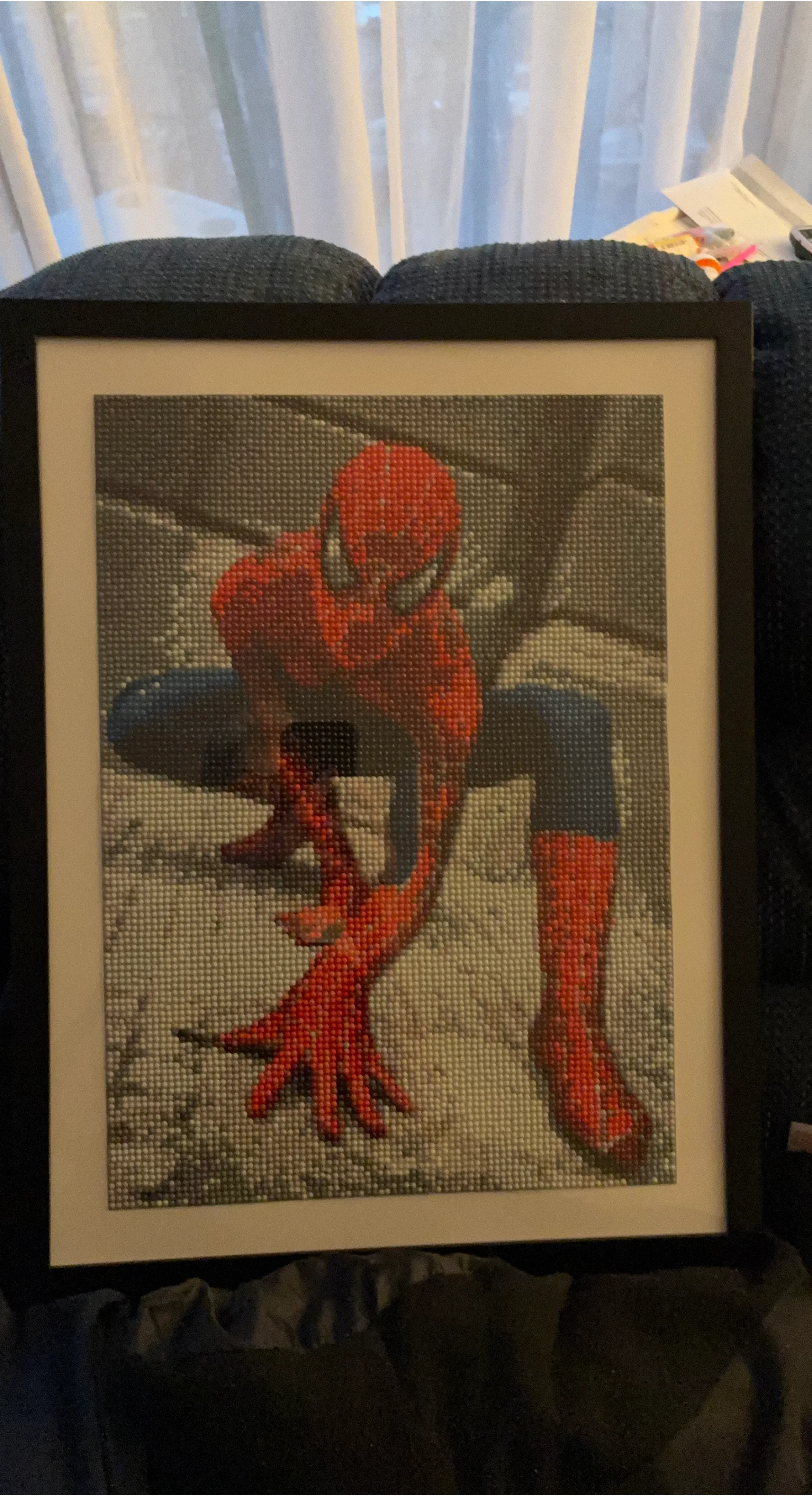 Diamond painting featuring Spider-Man in a dynamic pose. It's framed and ready to hang. This artwork is a great addition for any Marvel fan's collection!