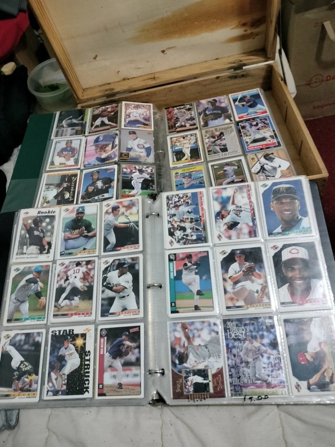 This is a collection of assorted baseball cards in 2 binders. Includes various players and some 'rookie' cards. Some cards feature players from teams like the Mariners and Astros. One card shows a price of $5.00.