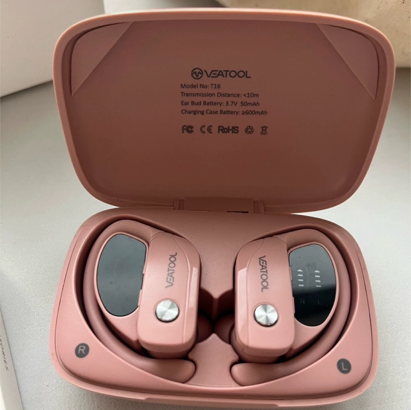 Veatool T16 model wireless earbuds. Earbud battery 3.7V 50mAh. Charging case battery 2600mAh. Transmission distance is less than 10m.