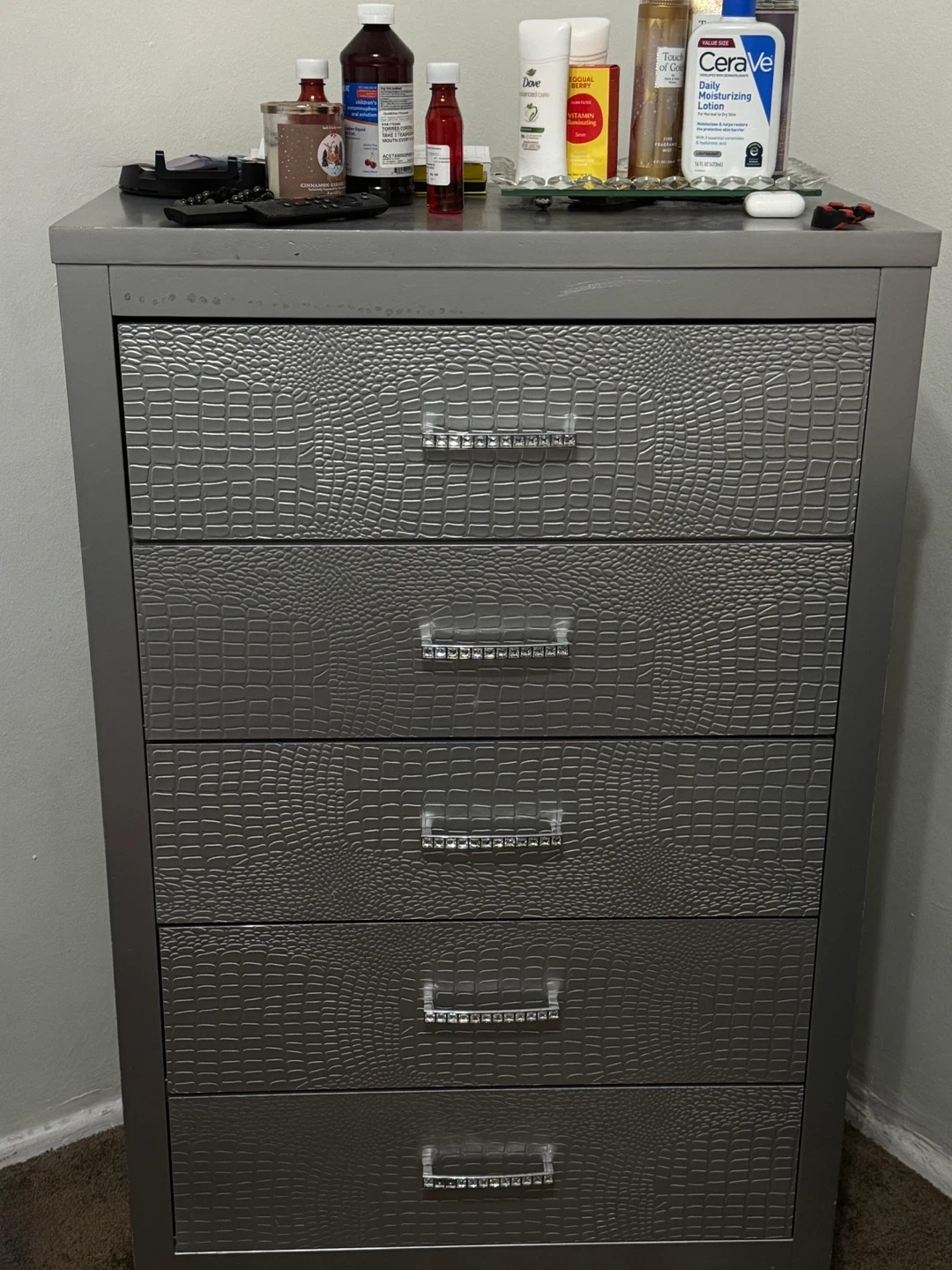 This dresser features a unique gray crocodile-embossed finish on its five drawers. Crystal drawer pulls add a touch of sparkle. It's a stylish storage solution for any bedroom!
