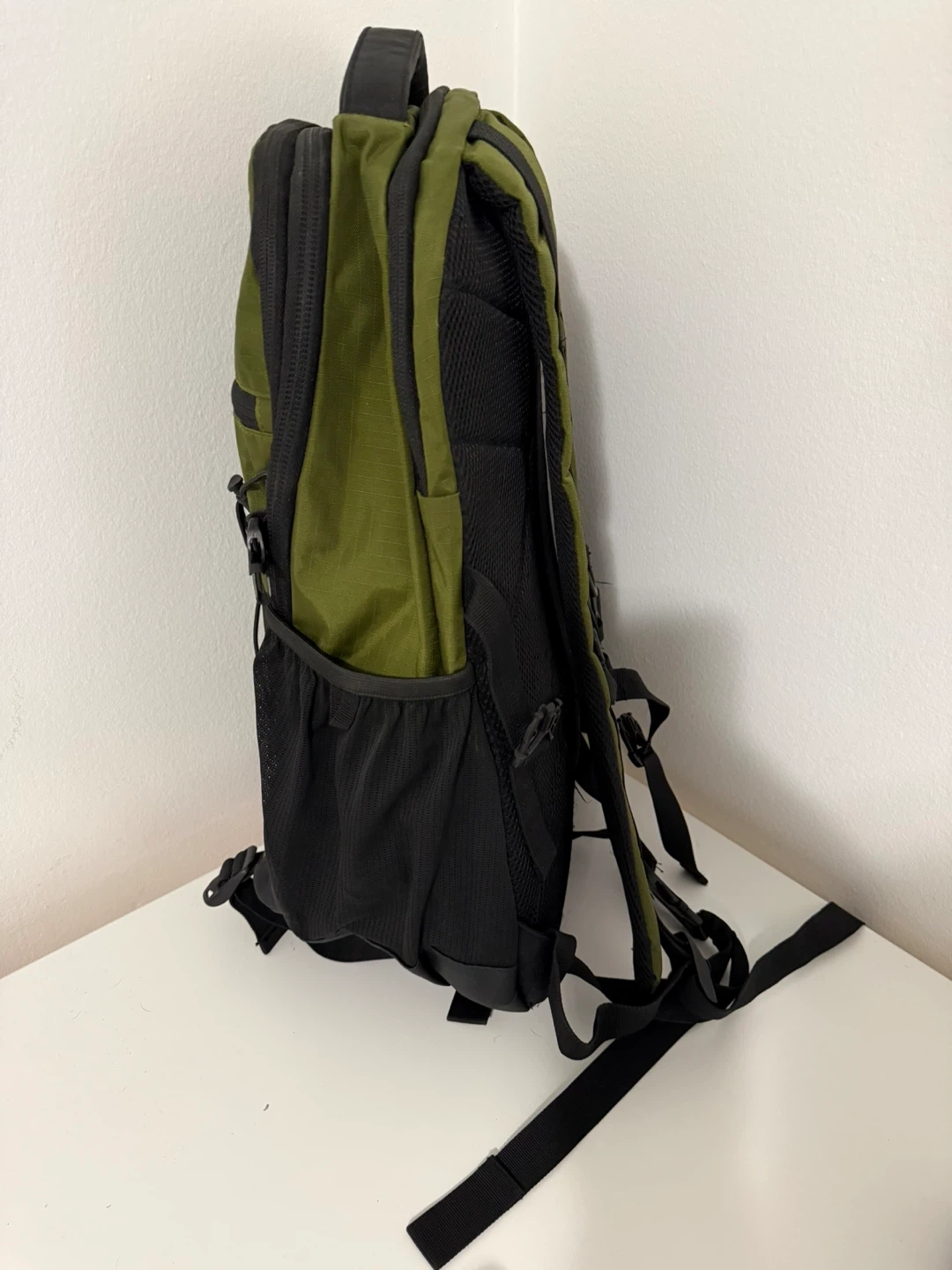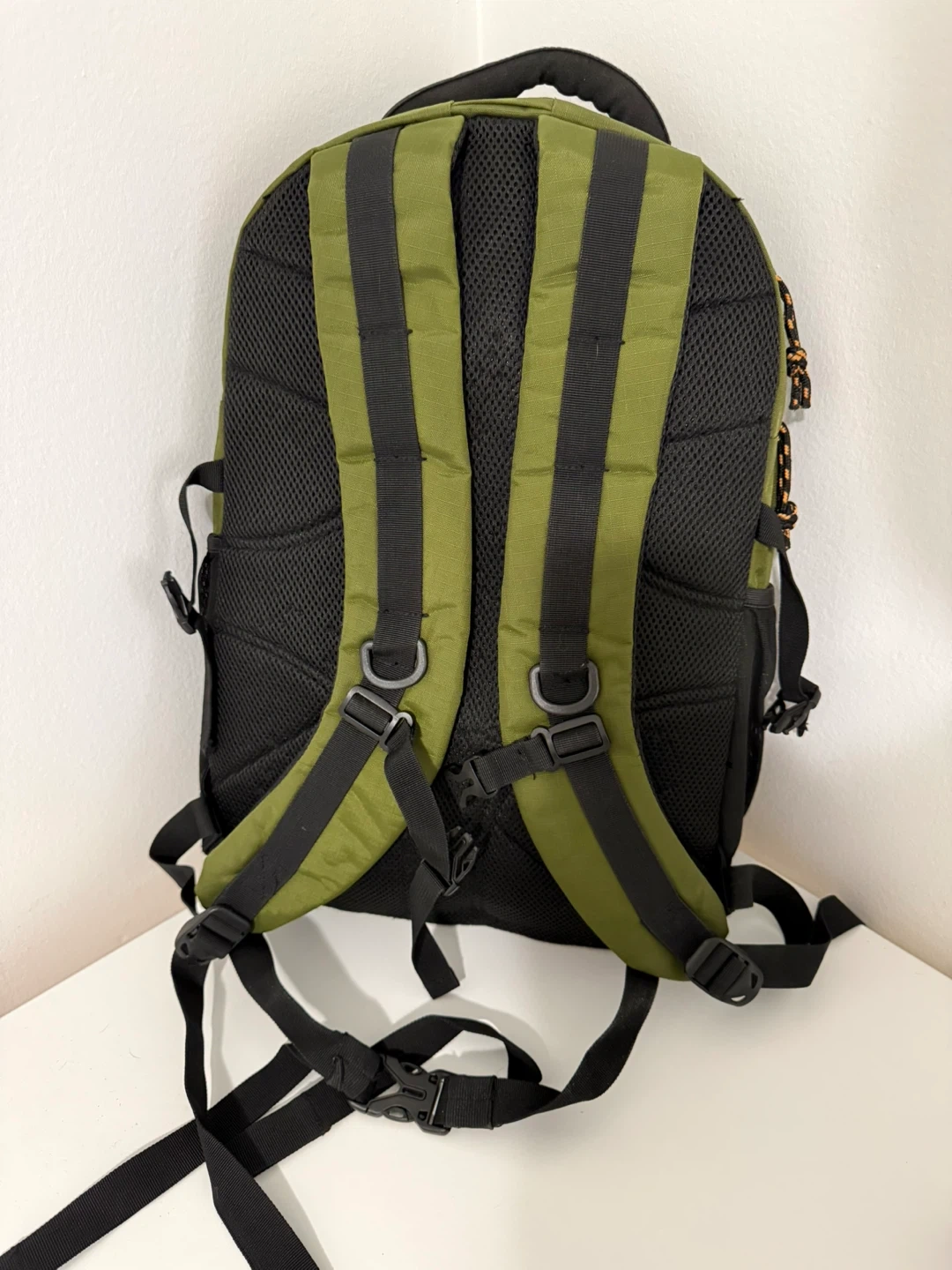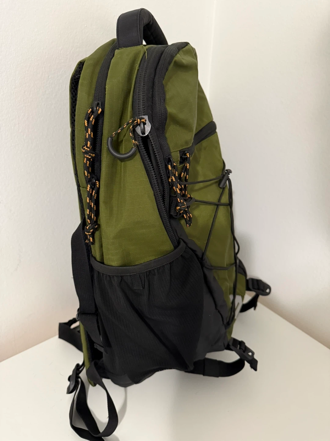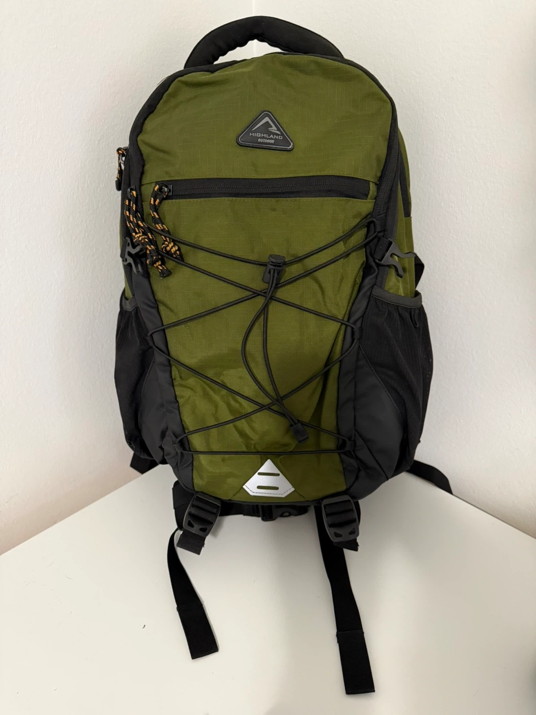 This Highland Trail backpack is in an olive green colour. It has multiple zippered pockets and mesh side pockets for water bottles. The padded back and adjustable straps make it comfortable for hiking or travel.