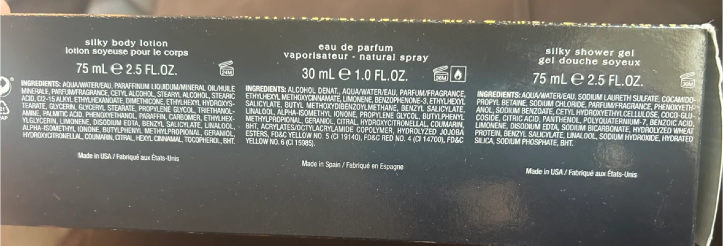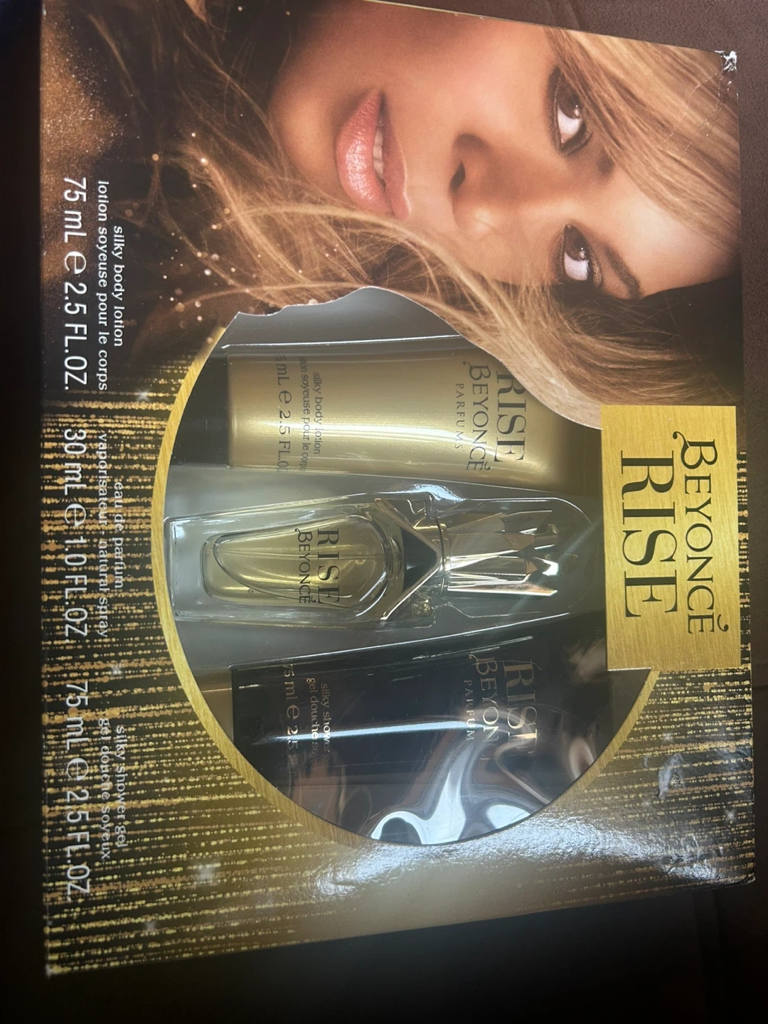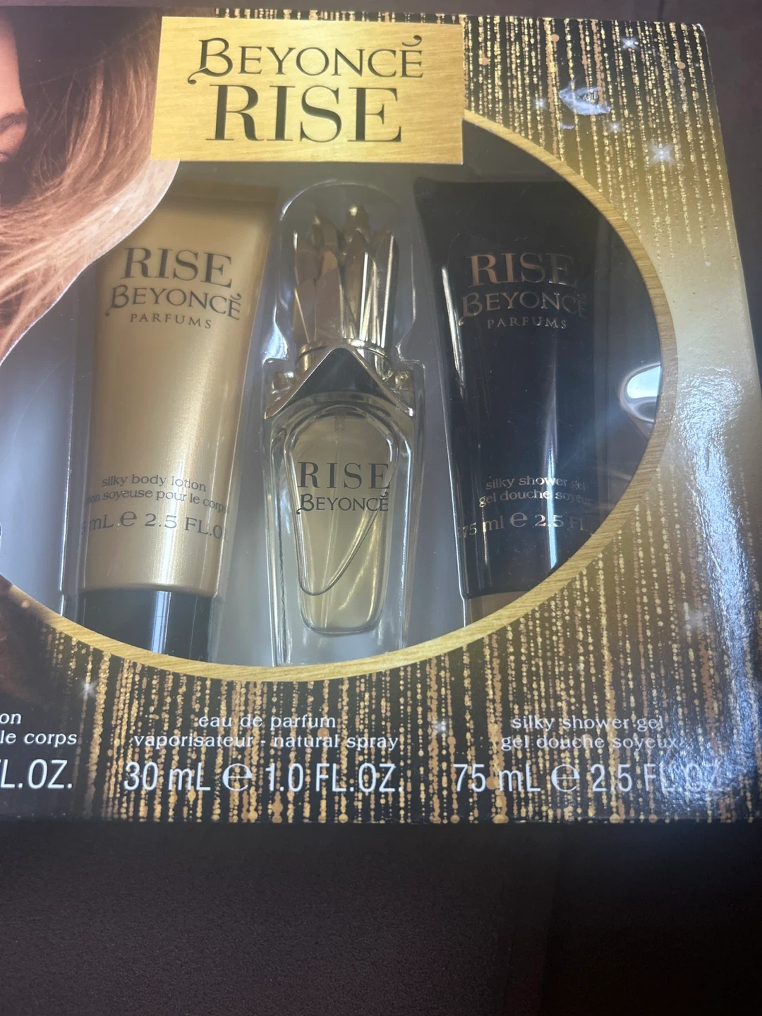 Beyonce Rise fragrance gift set. Includes 1.0 fl oz eau de parfum natural spray, 2.5 fl oz silky body lotion, and 2.5 fl oz silky shower gel. Made in USA/Spain.