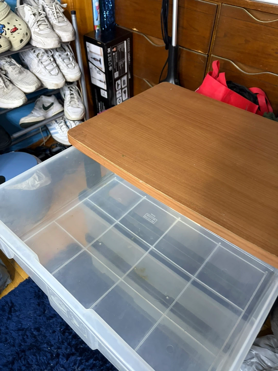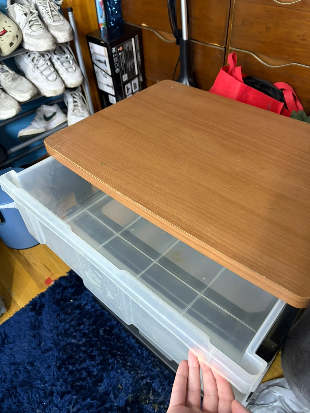 3-tier clear storage bin with wooden top
