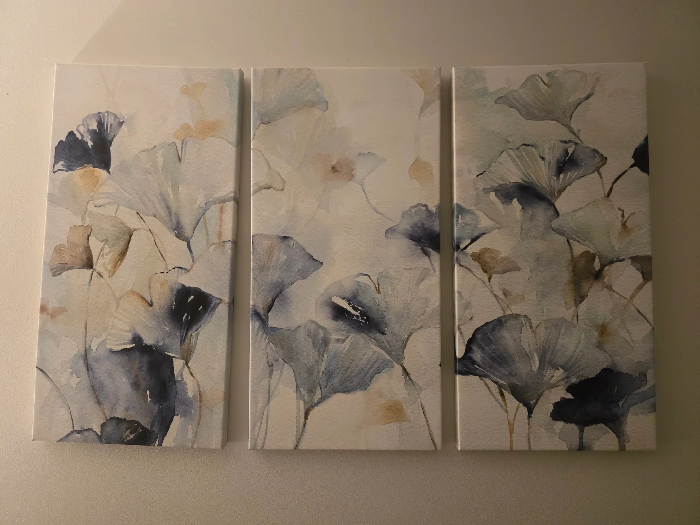 A set of three canvas prints featuring a watercolour design of ginkgo leaves. The artwork displays a serene palette of blues, greys, and subtle beige tones. It's a triptych, with each panel contributing to the overall floral composition.