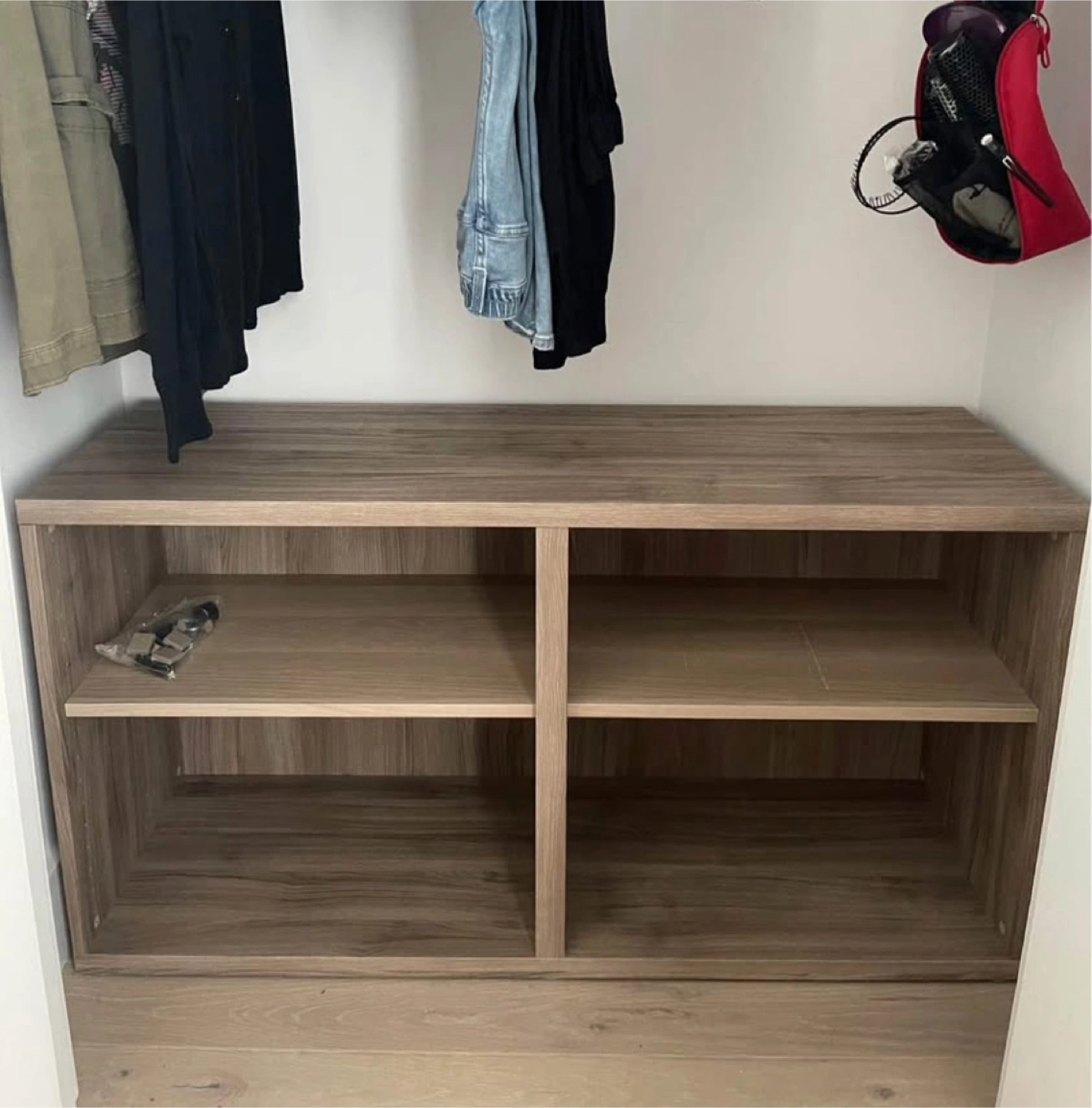 Retail is $95 for the frame and two shelves. There is a scratch on one of the shelves (pictured). It can be used as a closet organizer, TV stand, bookcase, and many other purposes.