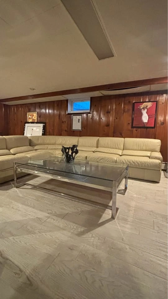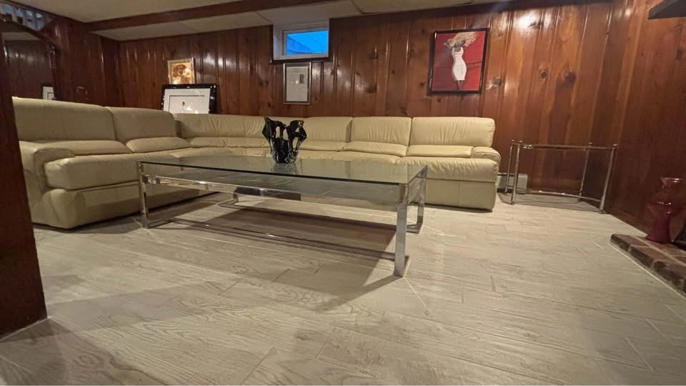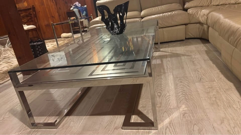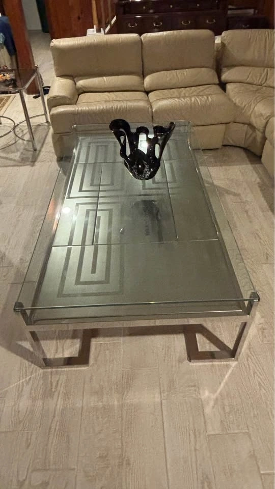 Unique, large rectangular coffee table with silver Greek Key pattern metal tiles set below the glass top. Comes with a coordinating vintage gas lighter. Not sure if it works - to me it was always like an art piece. In truly amazing condition considering its vintage age, has a small nick in the glass (noticeable only if you’re up close, pictured). Suitable for a large space. Mid-century Modern style, minimalist and retro. Measurements: 33” (width) x 63” (length) x 16 1/2” (height).