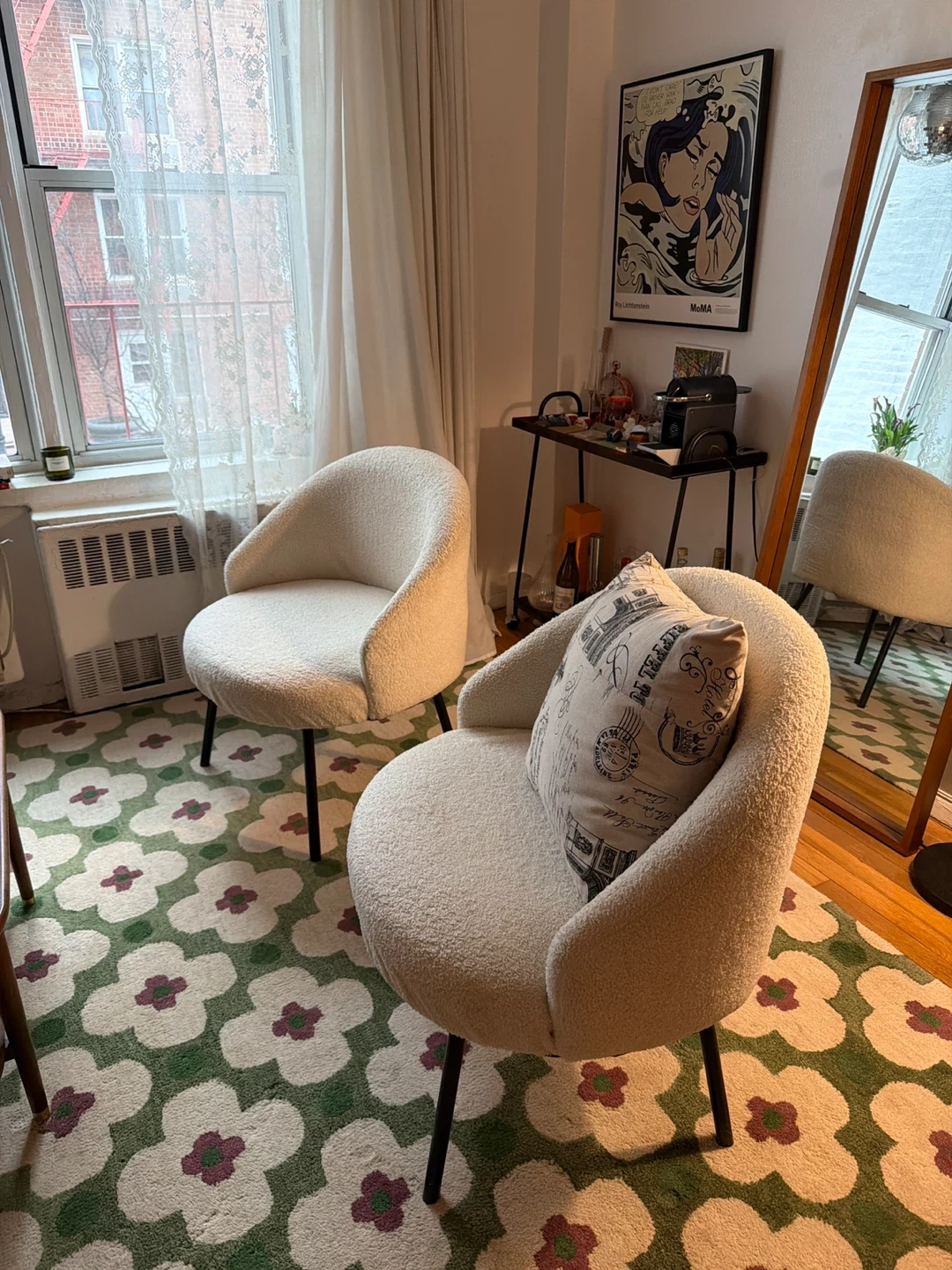Two cream boucle accent chairs with black metal legs. Upholstered in a soft boucle fabric. These chairs offer a comfortable and stylish seating option.