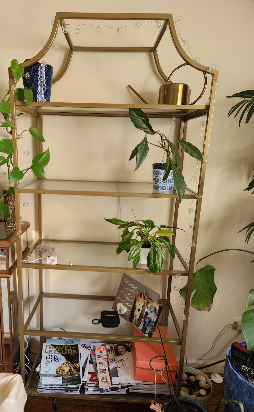 This elegant tiered shelf features a gold metal frame with clear glass shelves. It's perfect for displaying plants, books, or decorative items. The unique top design adds a stylish touch to any room!