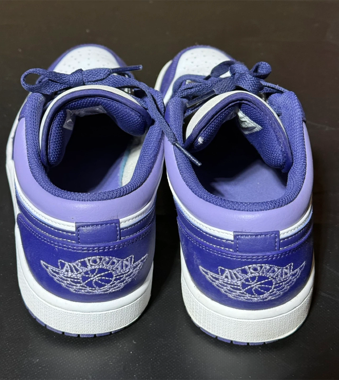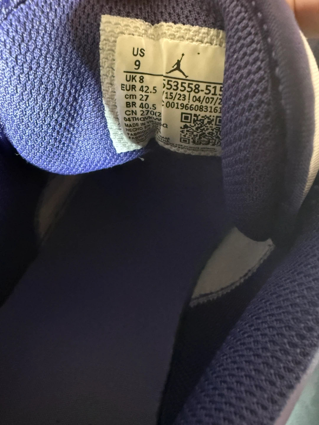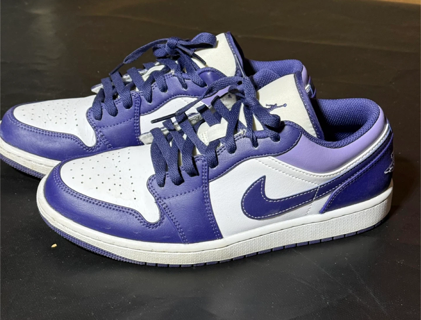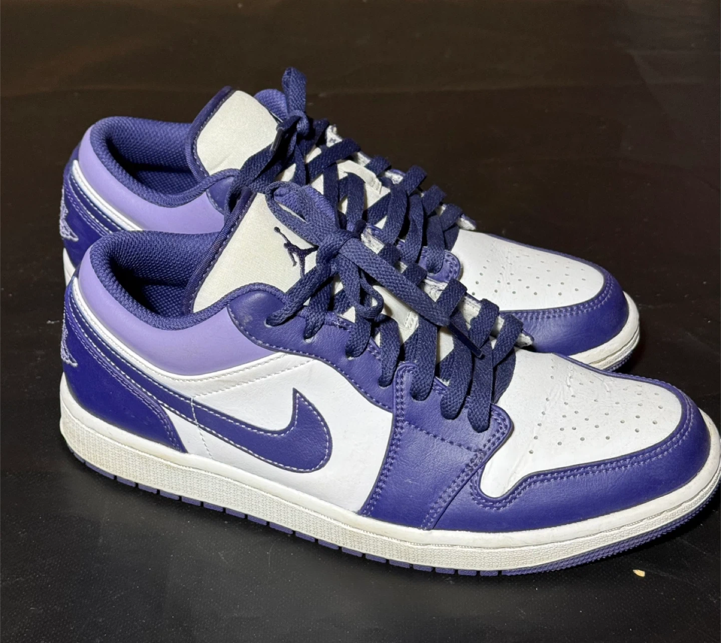 Air Jordan 1 Low in a purple and white colourway. They're a size US 9. In almost new condition, wore 10 times.