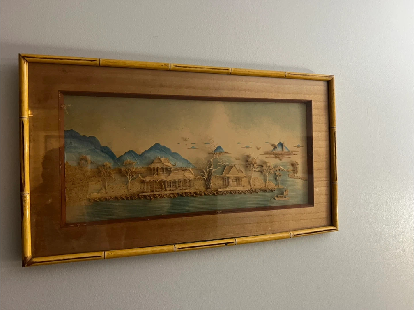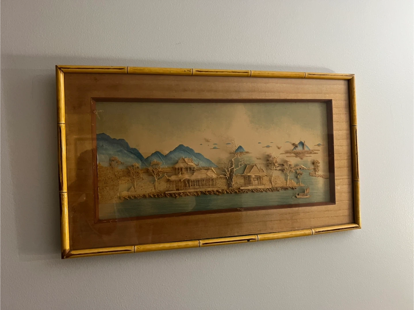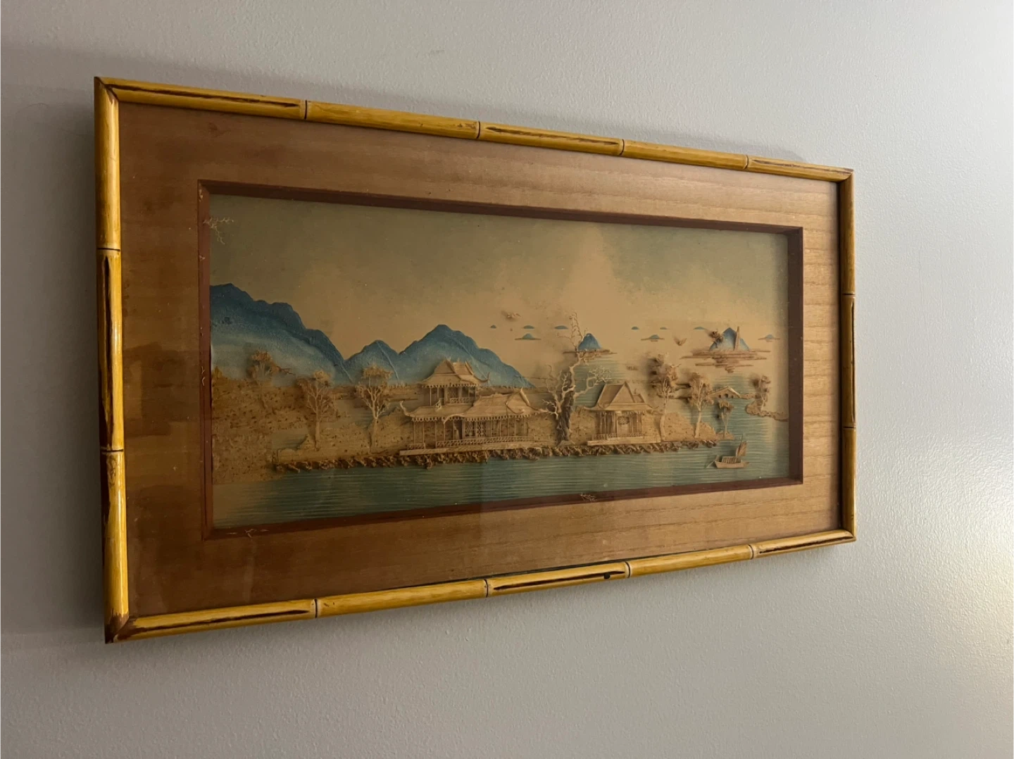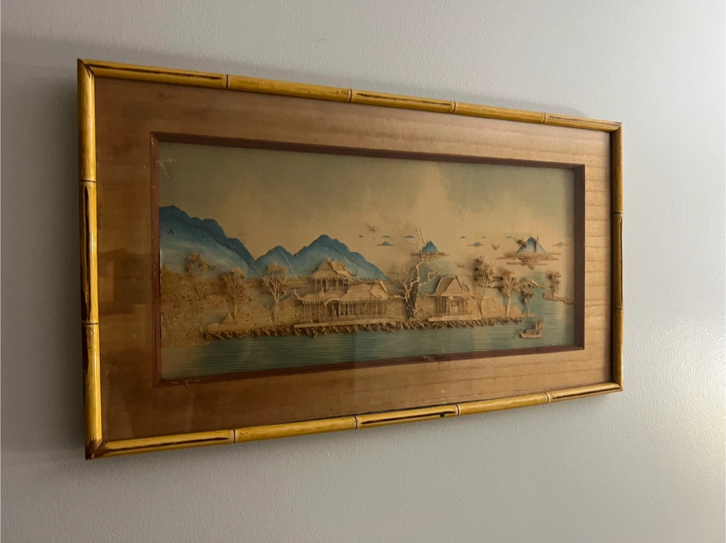 A framed piece of artwork depicting an Asian landscape with houses and mountains. It has a bamboo-style frame. Adds a serene touch to any room!
