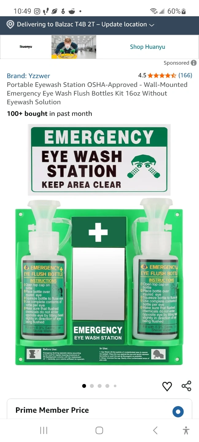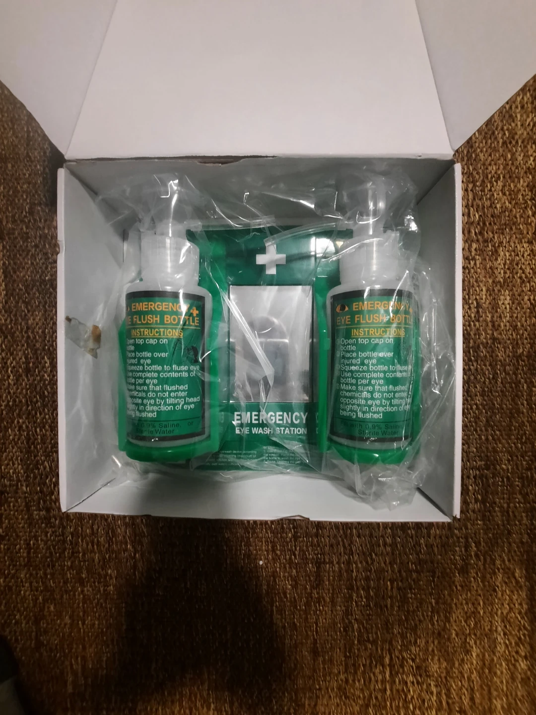 This is a portable eyewash station kit. It includes two 16oz eyewash flush bottles and a wall-mounted holder. The bottles are not filled It's OSHA-approved.