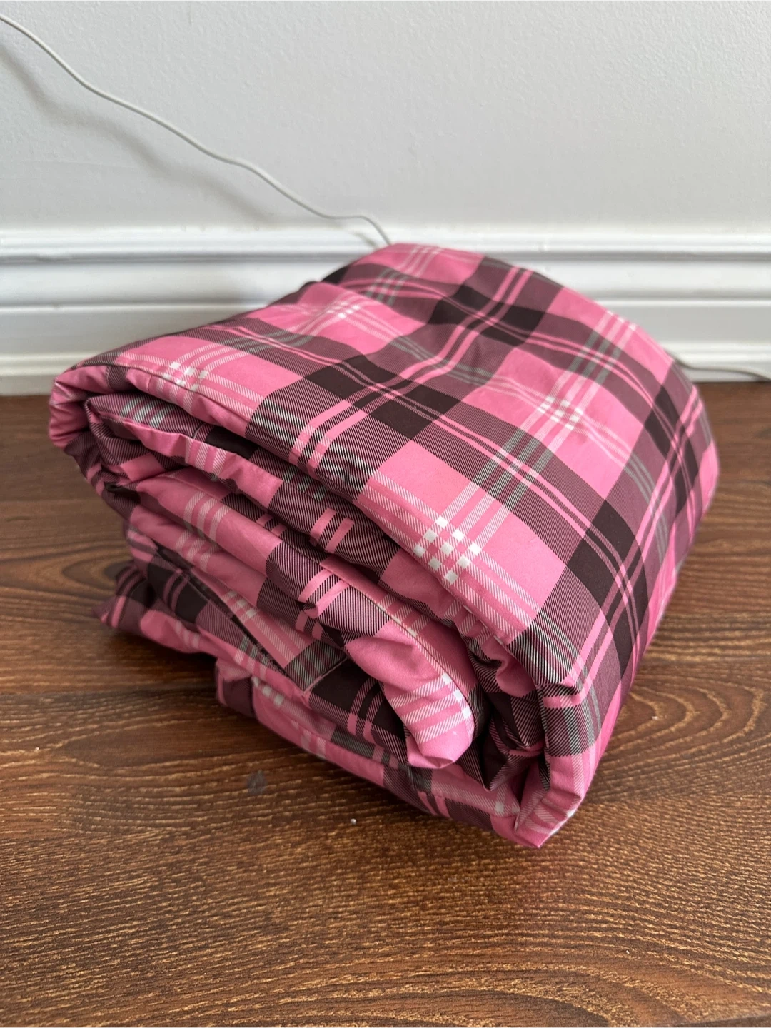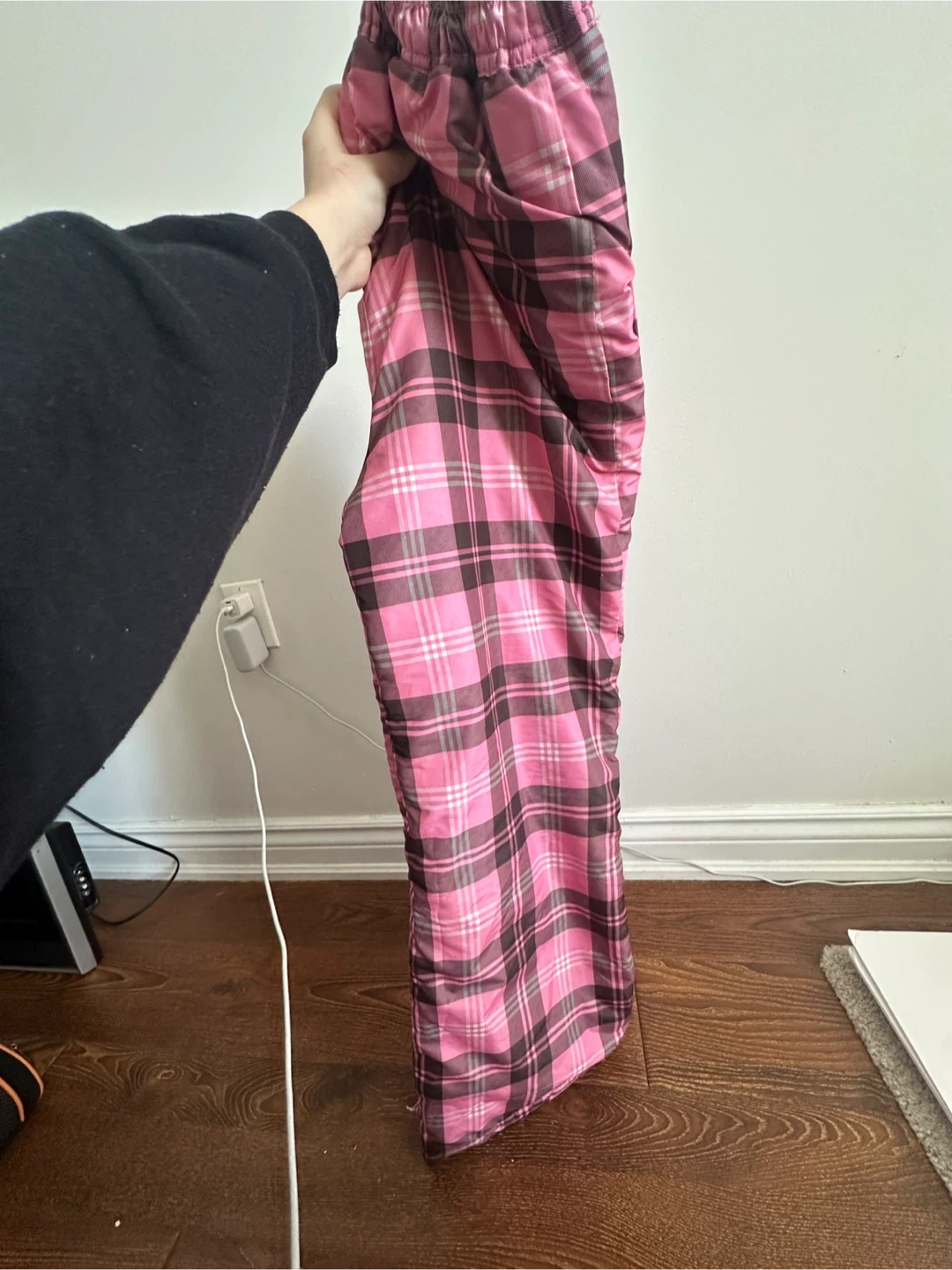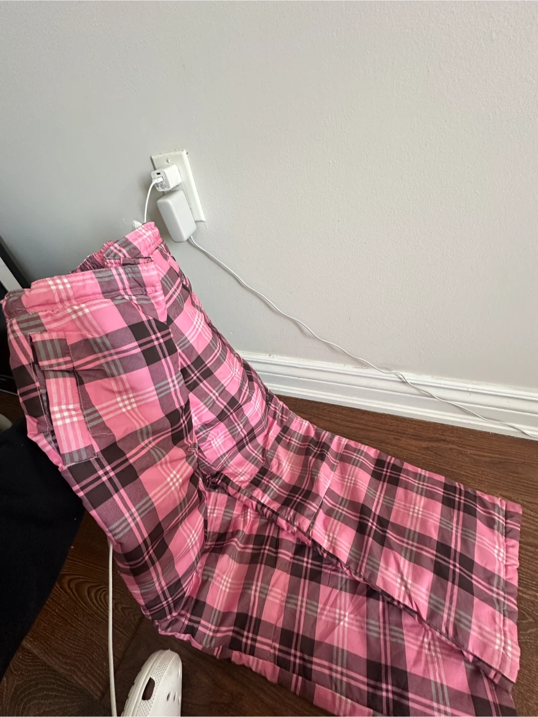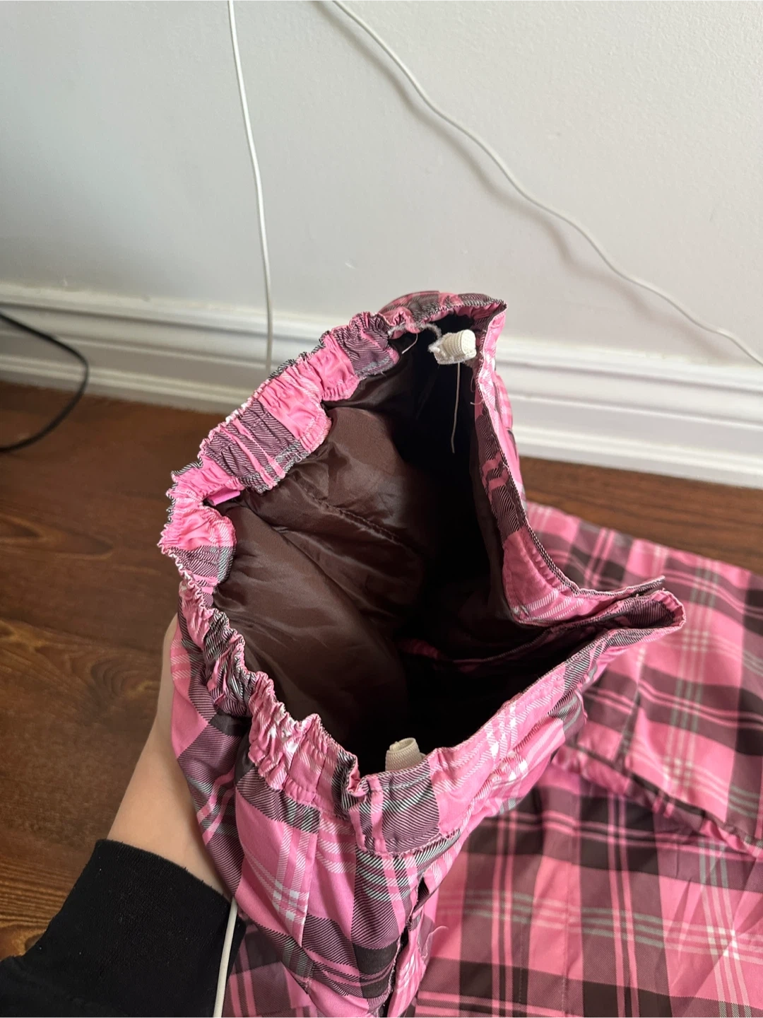 These are insulated snow pants with a pink and brown plaid pattern. They feature a comfortable elastic waistband and adjustable velcro closures at the cuffs. Perfect for staying warm and dry during winter activities!
