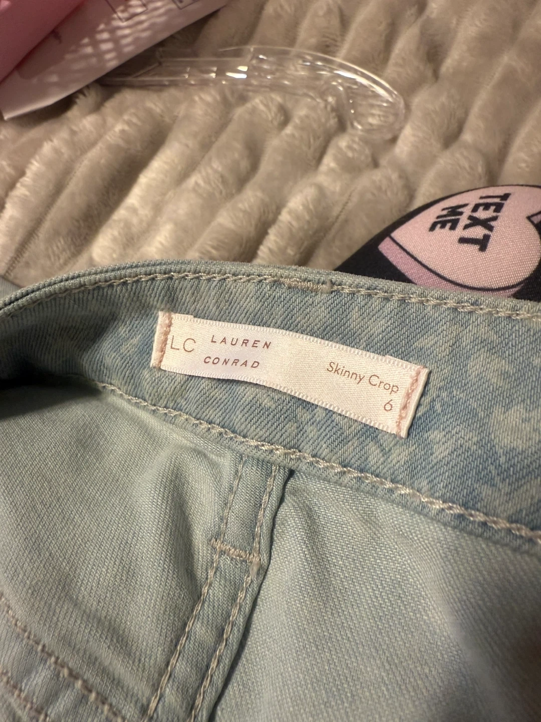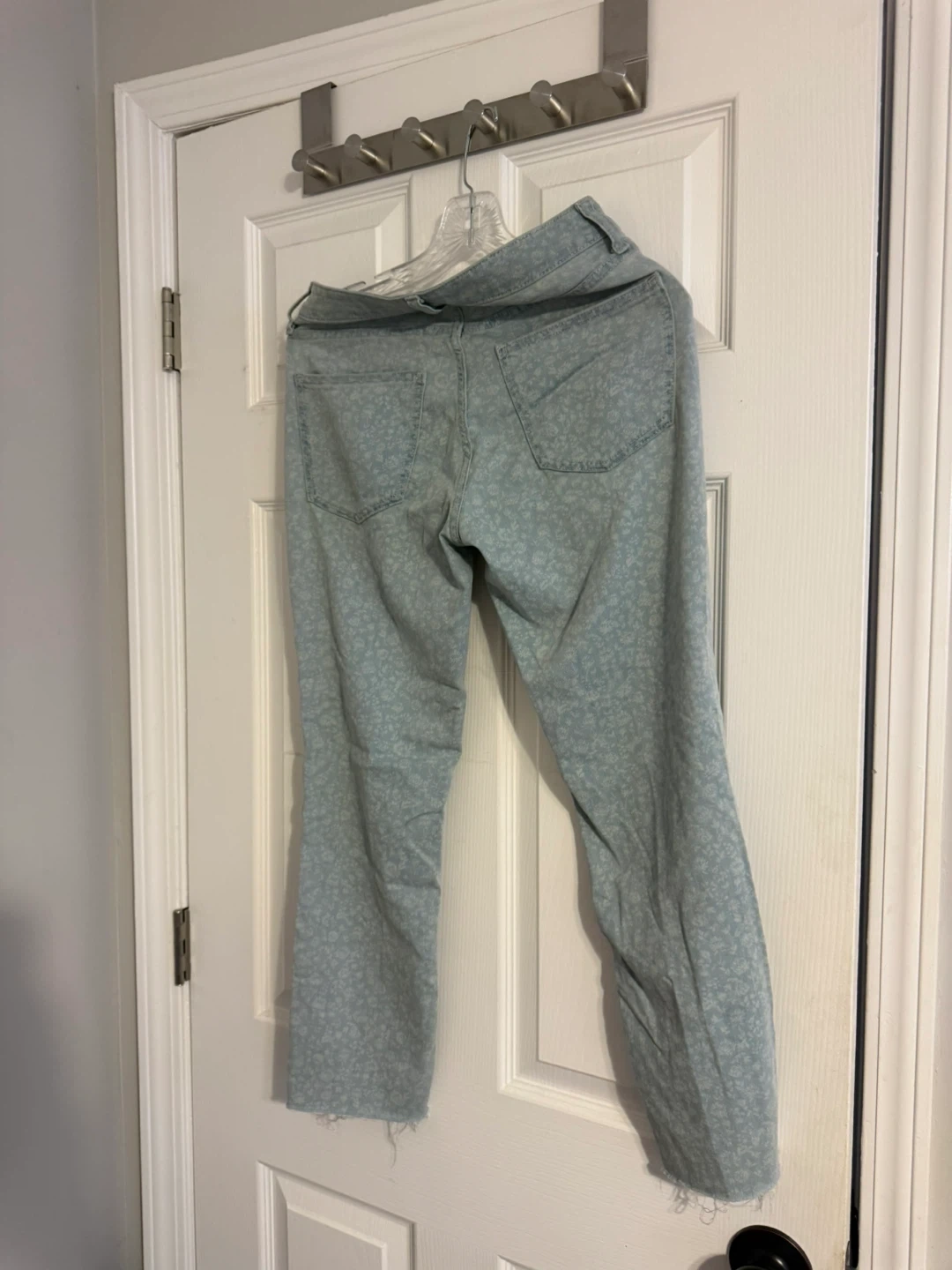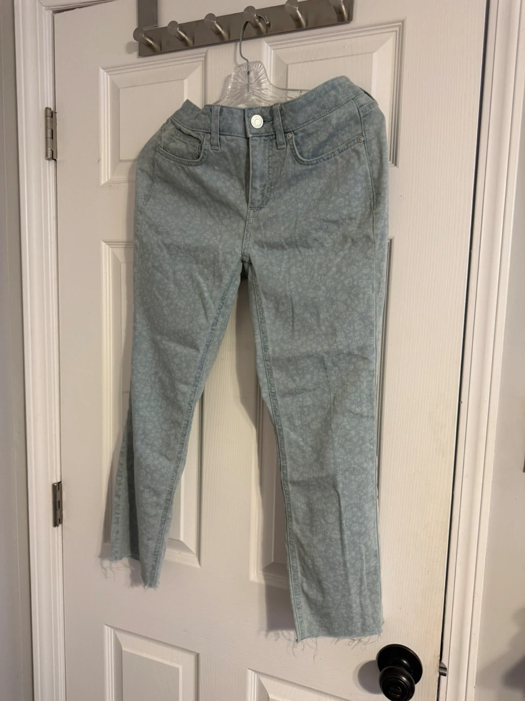 Selling a pair of LC Lauren Conrad skinny crop jeans in a light blue floral pattern. They are a size 6 and in great condition! Perfect for a casual, stylish look