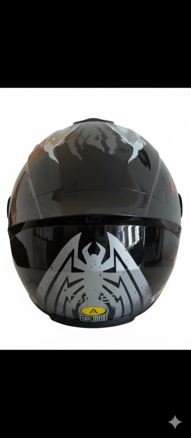This full face motorcycle helmet features a striking Venom graphic design. It's constructed for protection and style. Includes a tinted visor for visibility.