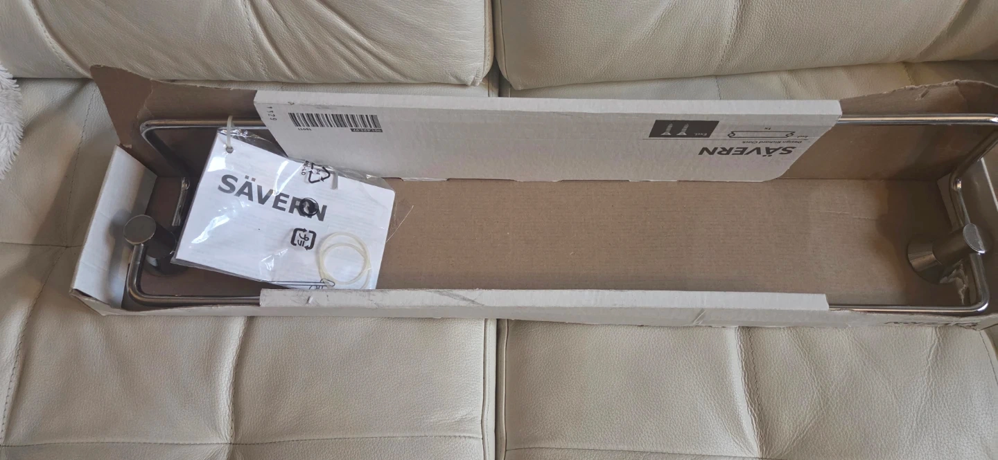 This is a stainless steel double towel rail from IKEA, part of the SÄVERN collection. It's designed by Richard Clack. Screws are not included. The box is worn, but the towel bar is new.