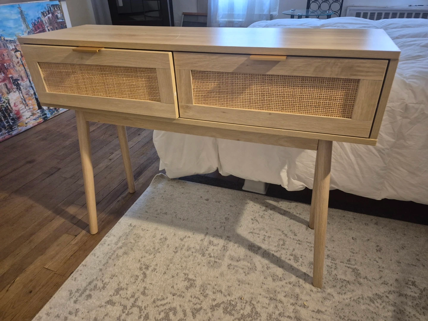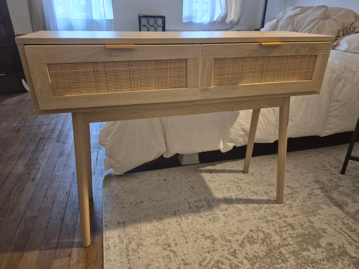 Console table with two drawers - rattan-front cabinets drawers . Light wood finish with gold drawer pulls. Slim design with tapered legs.