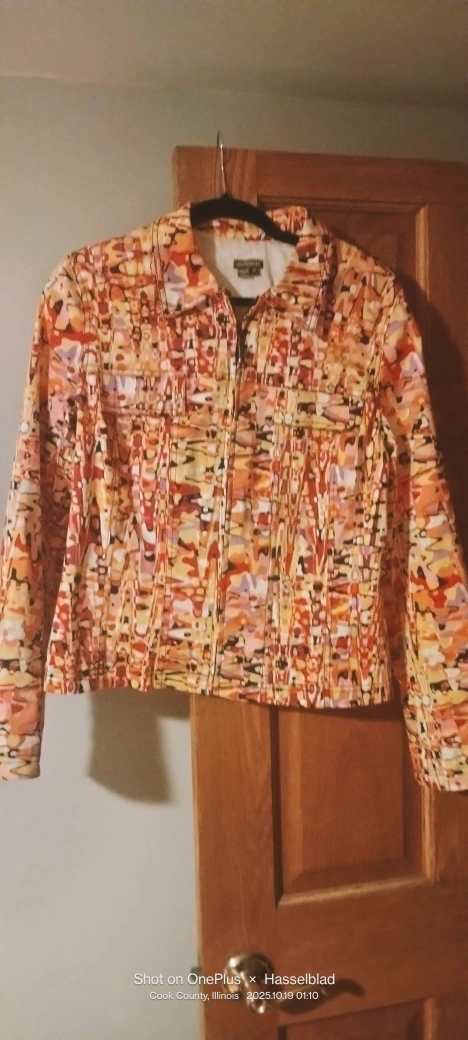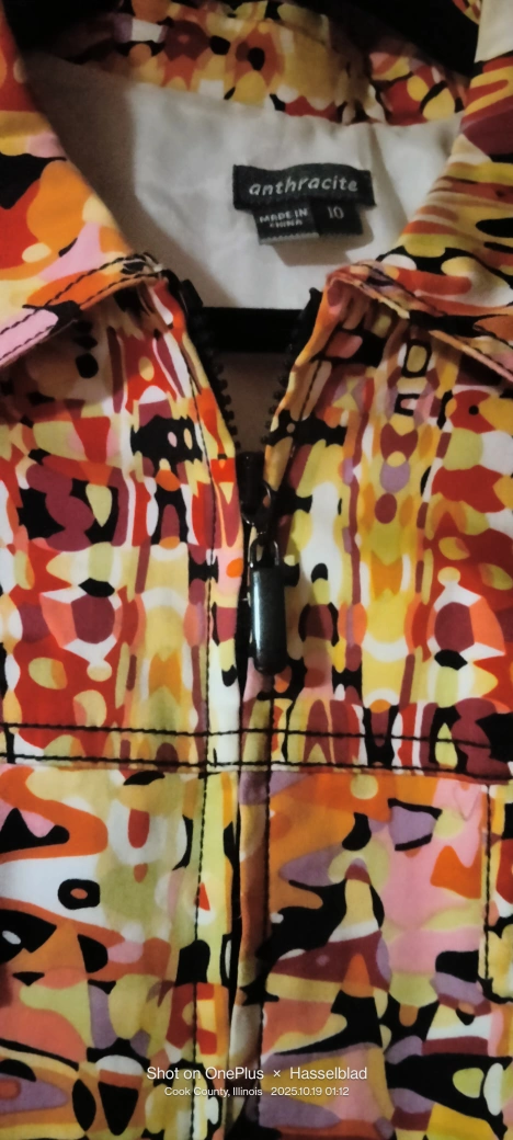 Selling a cute jacket from Anthracite! It's a size 10 and made of 97% Cotton, 3% Spandex, with a 100% Acetate lining. The jacket has a unique pattern and would be a great addition to your wardrobe in gently used condition