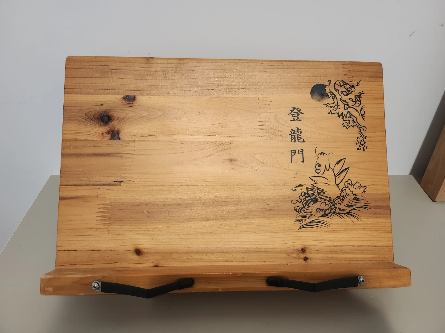 This wooden book stand features a unique dragon design with Chinese characters. It has an adjustable stand on the back for stability. Perfect for holding cookbooks or other reading materials while you work or study.