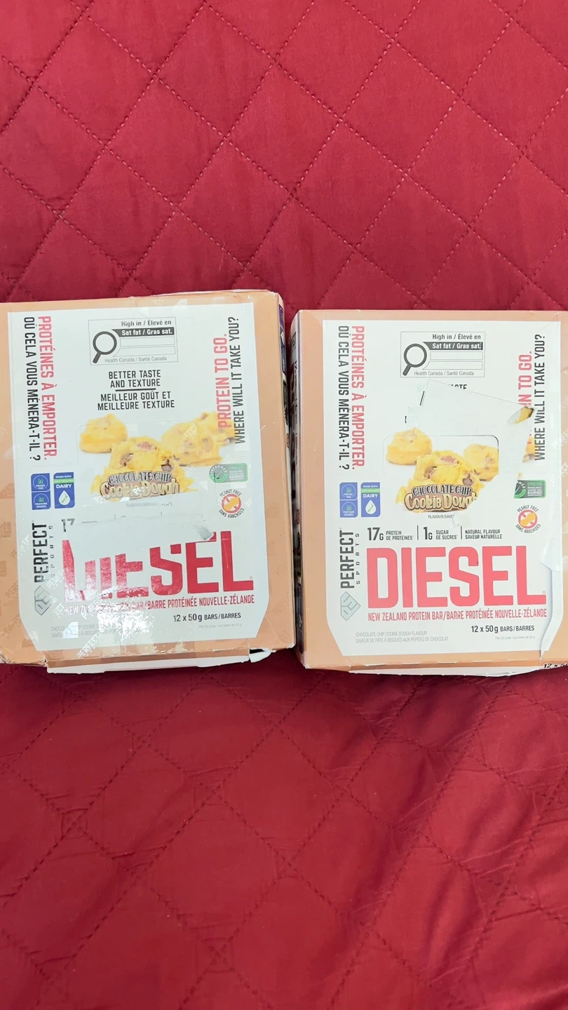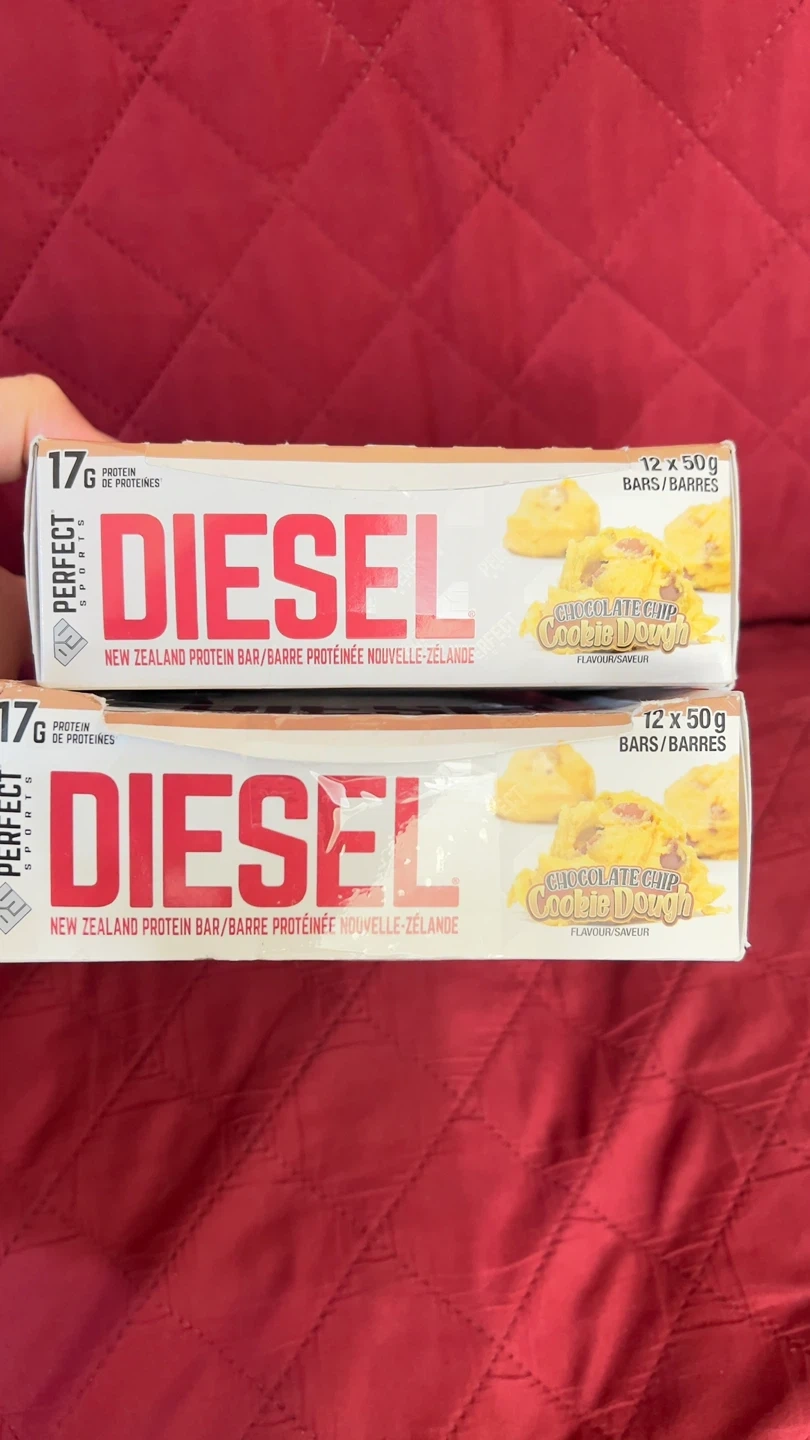 Two boxes of Perfect Sports Diesel protein bars. Each box contains 12 x 50g bars. These bars are made in New Zealand and come in Chocolate Chip Cookie Dough flavour. They offer 17g of protein per bar. BB/MA date is 2027 FE 18. $25 each pack
