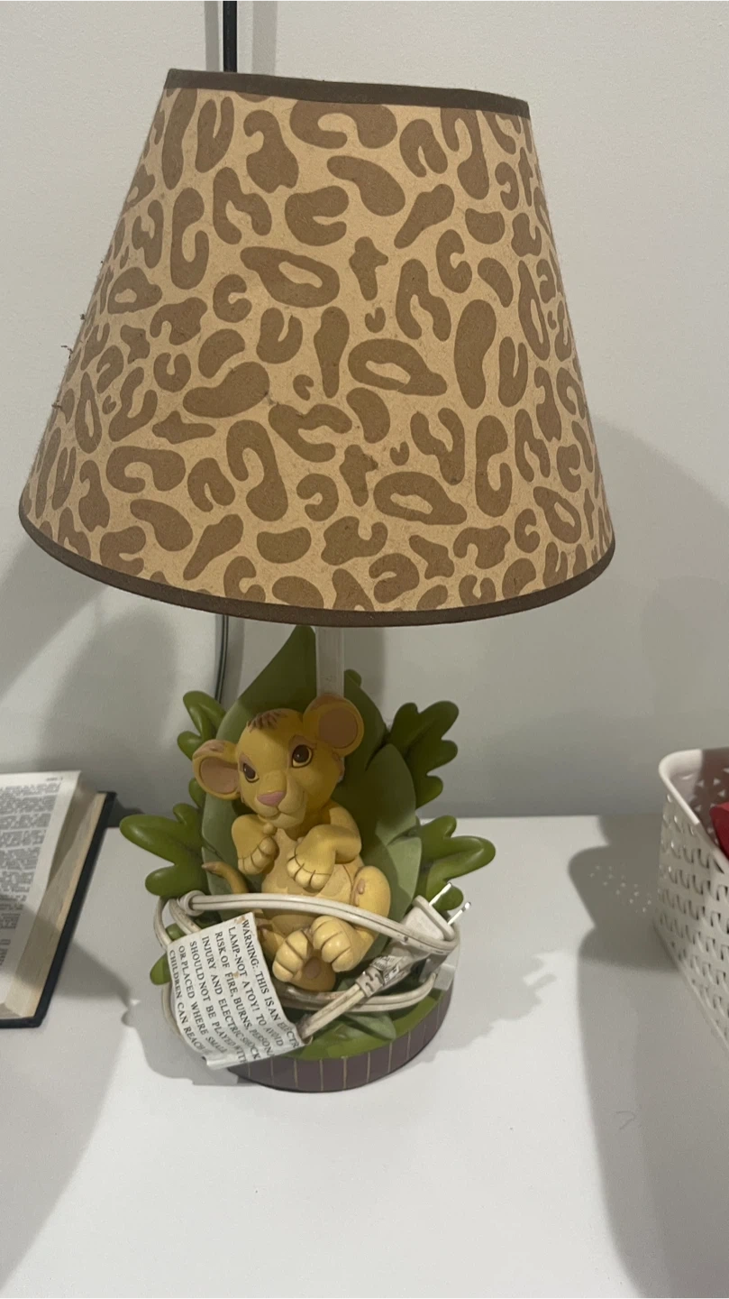 This is a Disney's The Lion King night light lamp featuring Simba. The lampshade has a leopard print design. It's a fun and decorative item for a child's room! Made of durable material.