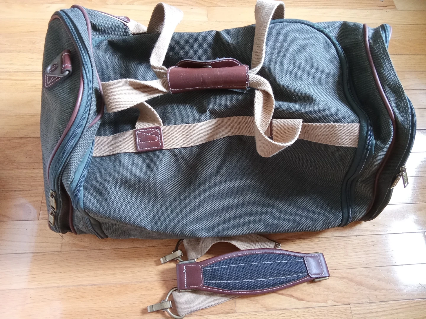 Green duffel bag with brown leather trim. It has top handles and a detachable shoulder strap. Zipper closure.